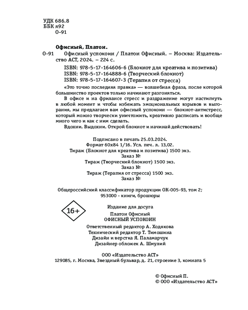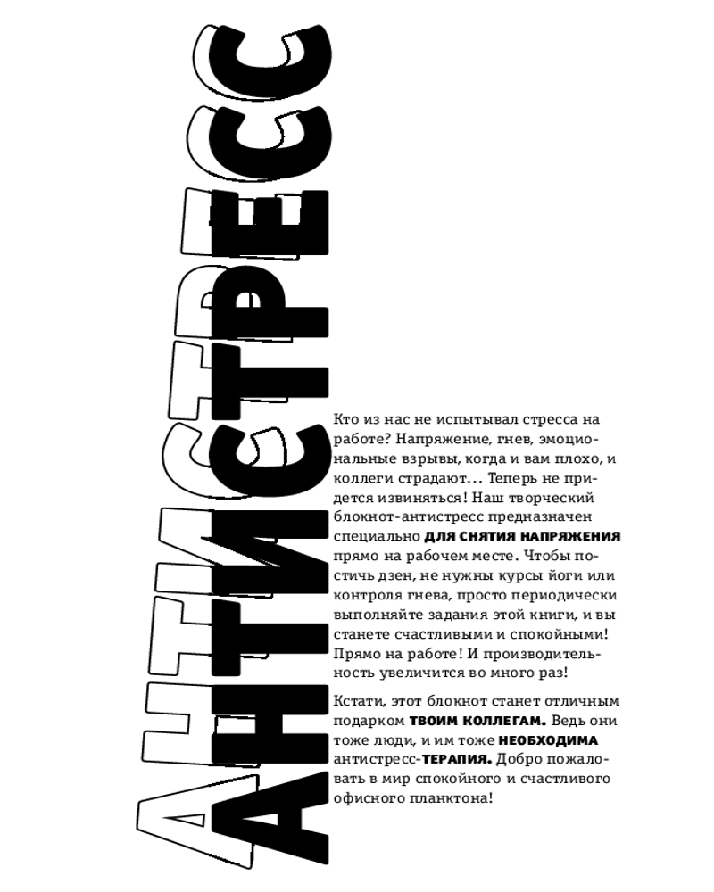 Серия: Терапия от стресса «Это точно последняя правка» — волшебная фраза, после которой большинство проектов только начинают разгоняться. В офисе и на фрилансе стресс и раздражение могут настигнуть в любой момент, и, чтобы избежать эмоциональных взрывов и выгорания, мы предлагаем вам офисный успокоин — блокнот-антистресс, который можно творчески уничтожить, креативно расписать и вообще много чего и как с ним сделать. |