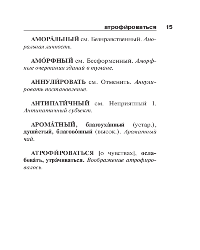 В издание включены наиболее употребительные слова русского литературного языка, живой разговорной речи, некоторые специальные термины, имеющие широкое распространение, а также ряд устаревших слов, встречающихся в произведениях художественной литературы. Все слова, кроме односложных, снабжены ударением. К каждому слову даётся краткое толкование, синонимы сопровождаются указанием на особенности, сферу употребления и сочетаемость. Словарные статьи проиллюстрированы примерами. Издание подходит для всех, кто стремится лучше овладеть родным языком, повысить культуру речи, обогатить свой словарный запас. |