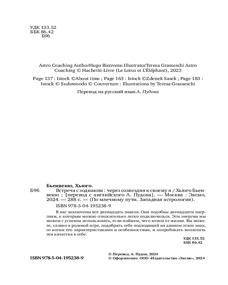 💳 Оплатить за товар можно при получении 🇰🇿 Есть бесплатная доставка по Казахстану от 1 дня 🎁 Копите бонусы с каждой покупки Серия: По млечному пути. Западная астрология Хьюго Бьенвеню — духовный наставник, врач-фармацевт и астролог. Он отвергает догмы и рассматривает свою работу как приглашение к возможным путям развития. Эта книга — новый взгляд с «щепоткой» эзотерики на привычное понимание тропического Зодиака. Двенадцать астрологических знаков — это мощные и красноречивые архетипы. Астрология использует их «духовным инструментом» для человека рефлексирующего, сомневающегося, стремящегося меняться, исцеляться эмоционально и духовно, способного бросить себе вызов. |