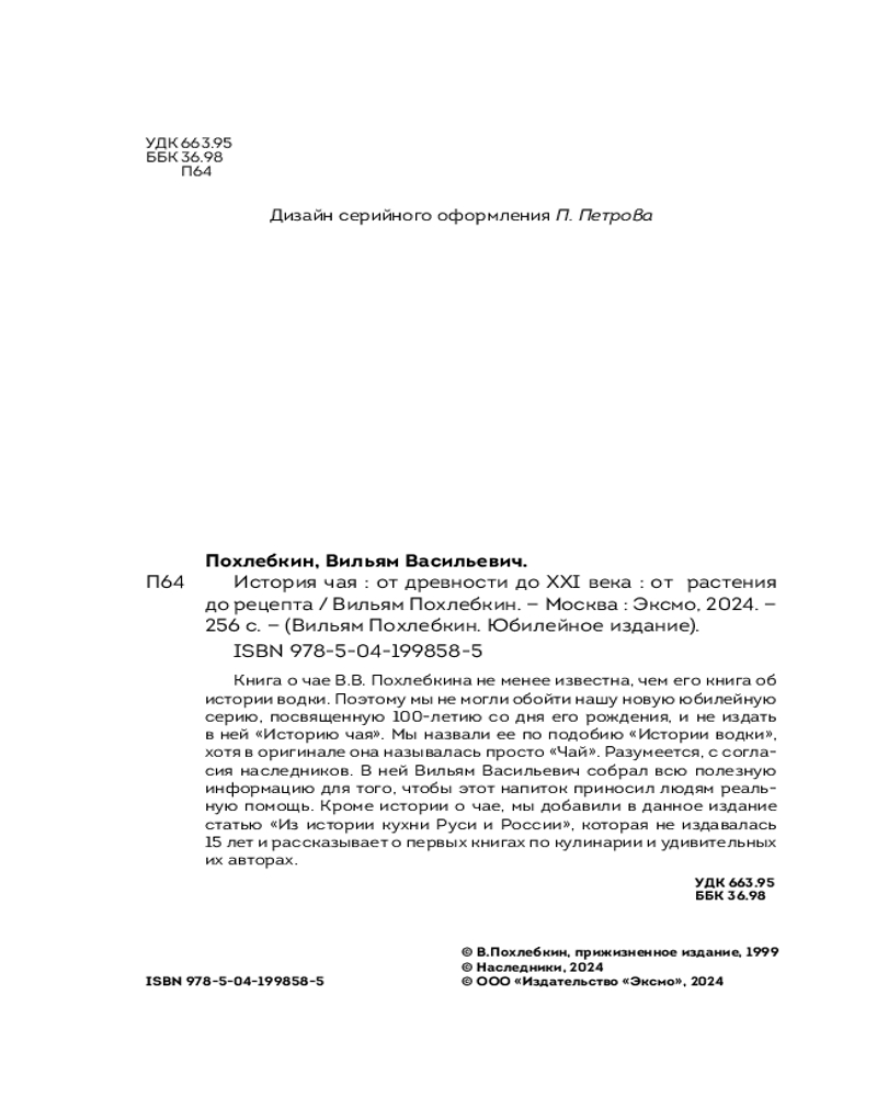 💳 Оплатить за товар можно при получении 🇰🇿 Есть бесплатная доставка по Казахстану 🎁 Копите бонусы с каждой покупки Серия: Вильям Похлебкин. Юбилейное издание Если вы хотите действительно понять, что такое чай как растение и как напиток, то нет издания более серьезно продуманного, исторически точного и с любовью написанного, чем «Чай» Вильяма Похлебкина. Это касается, впрочем, всех его книг, в которых он описал многочисленные процессы в кулинарии с педантичностью историка и одержимостью кулинара. А эта история чая еще связана и с зарождением чаеводства в советские времена у нас в стране, что небезынтересно всем любопытствующим историческим контекстом. Кроме того, в данную книгу мы включили статью «Из истории кухни Руси и России», которая расширит ваши знания не только о кулинарии, но и самом ее авторе. |