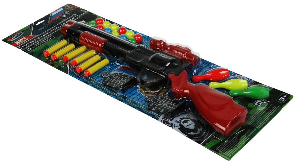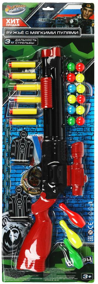 💳 Оплатить за товар можно при получении 🇰🇿 Есть бесплатная доставка по Казахстану от 1 дня 🎁 Копите бонусы с каждой покупки Игровой набор оружия «Военный» ТМ «Играем вместе» станет отличным подарком для юного героя. С таким интересным набором ребёнок будет придумывать увлекательные игровые сюжеты. Он также сможет потренировать свою меткость, стреляя из ружья мягкими пулями по мишеням и кеглям. Набор подойдёт для активных игр на воздухе и в помещении. |