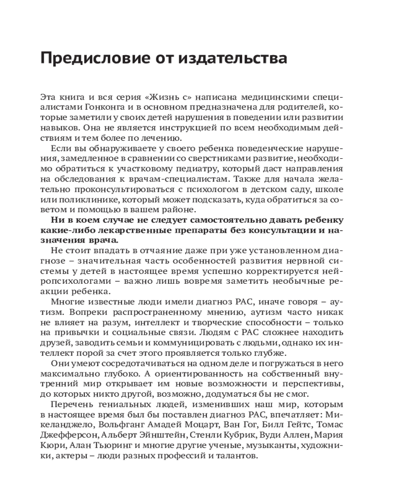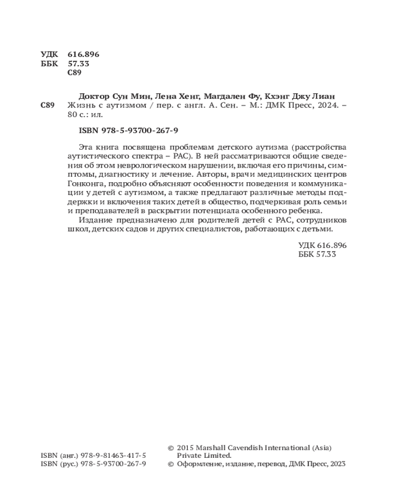 💳 Оплатить за товар можно при получении 🇰🇿 Есть бесплатная доставка по Казахстану от 1 дня 🎁 Копите бонусы с каждой покупки Серия: Жизнь и... Книга, которую вы держите в руках, посвящена проблемам детского аутизма (расстройства аутистического спектра — РАС). В ней рассматриваются полезные для родителей и педагогов общие сведения об этом неврологическом расстройстве, включая его причины, симптомы, диагностику и лечение. Авторы, врачи медицинских центров Гонконга, подробно объясняют особенности поведения и коммуникации у детей с аутизмом, а также предлагают различные методы поддержки и включения таких детей в общество. |