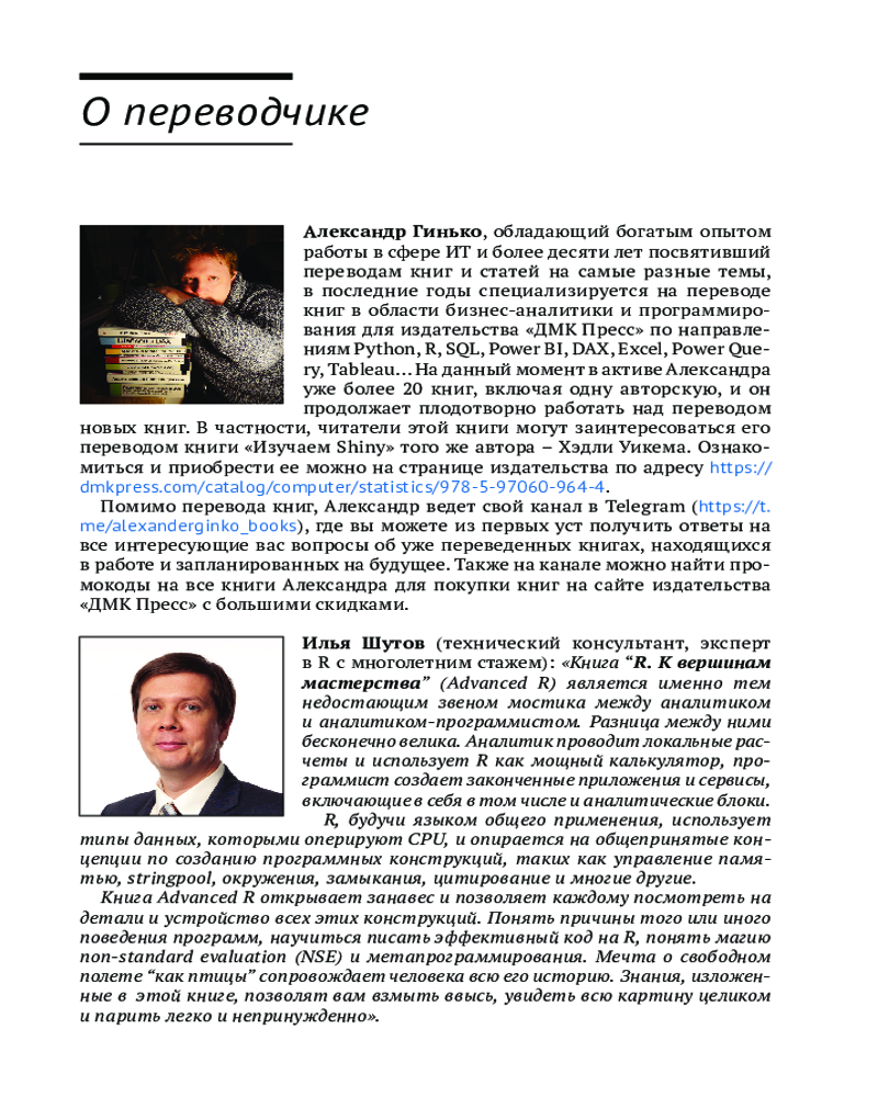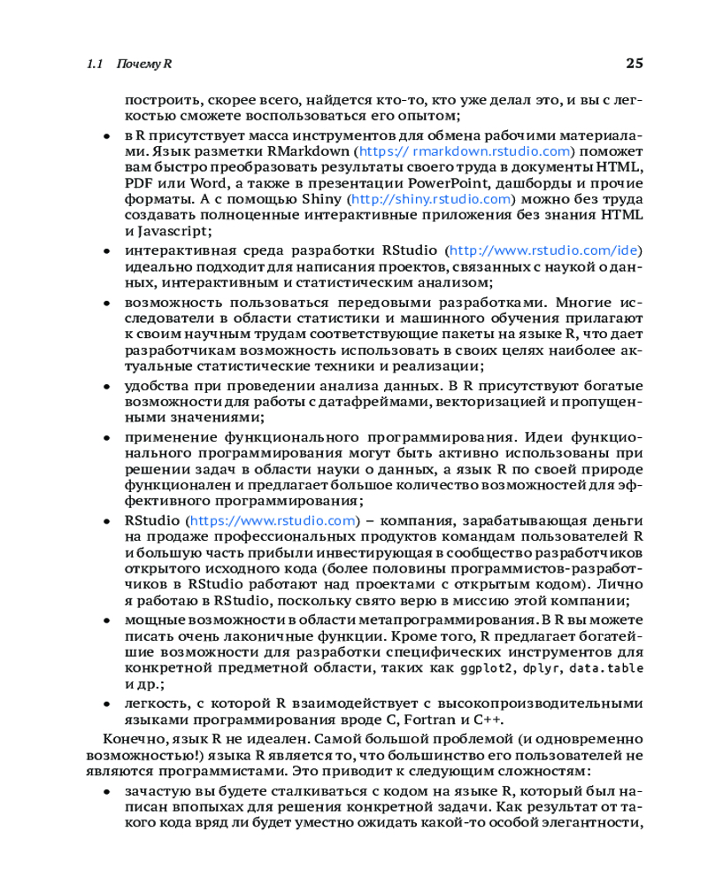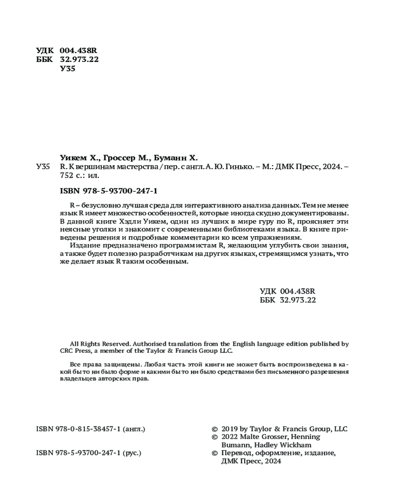 💳 Оплатить за товар можно при получении 🇰🇿 Есть бесплатная доставка по Казахстану от 1 дня 🎁 Копите бонусы с каждой покупки R — безусловно лучшая среда для интерактивного анализа данных. Тем не менее язык R имеет множество особенностей, которые иногда скудно документированы. В данной книге Хэдли Уикем, один из лучших в мире гуру по R, проясняет эти неясные уголки и знакомит с современными библиотеками языка. |