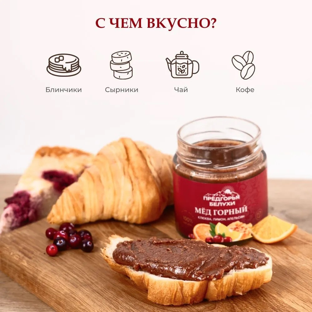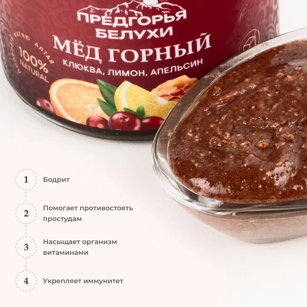 Предгорья Белухи Мёд горный натуральный с клюквой, лимоном и апельсином