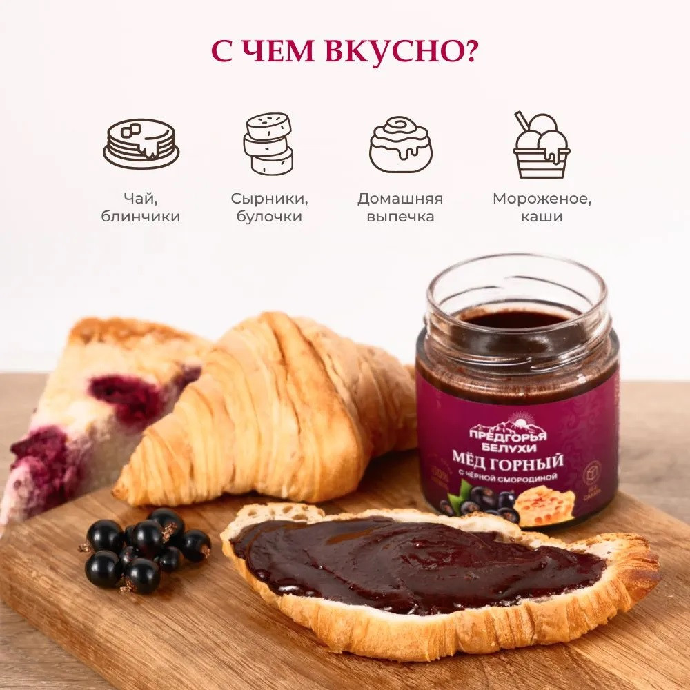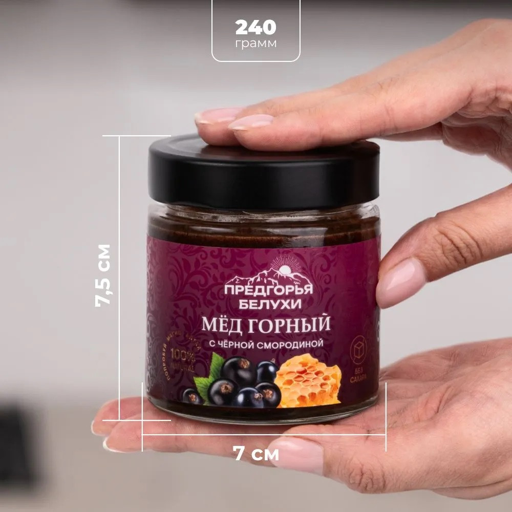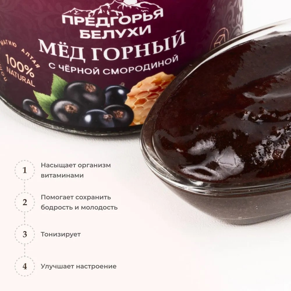 Горный алтайский мед с черной смородиной — богат витаминами А, С, Е, P, ОМЕГА-6 и микроэлементами. Мёд с черной смородиной придает энергии, а еще помогает сохранить бодрость и молодость. Мед натуральный алтайский с приятной ягодной кислинкой — полезный витаминный десерт. Придаст особый ягодный аромат выпечке и горячим блинчикам. И обязательно попробуйте его с мороженым!