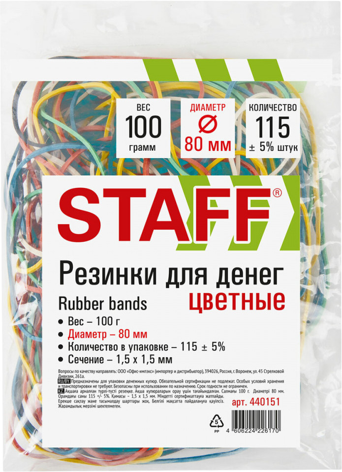 💳 Оплатить за товар можно при получении 🇰🇿 Есть бесплатная доставка по Казахстану от 1 дня 🎁 Копите бонусы с каждой покупки Банковские резинки Staff предназначены для фасовки и упаковки денежных купюр, мелких предметов на производстве, офисе, в различных учреждениях. Благодаря натуральному каучуку они могут свободно растягиваться в несколько раз и мгновенно возвращаются к своему первоначальному диаметру, равному 80 мм. Толщина в 1,5 мм гарантирует прочность изделия. Вес — 100 г. Количества около 115 штук хватит на продолжительное время. Цвет — ассорти. Данный товар — прекрасное соотношение доступной цены и высокого качества. Приобретайте универсальные банковские резинки Staff. |