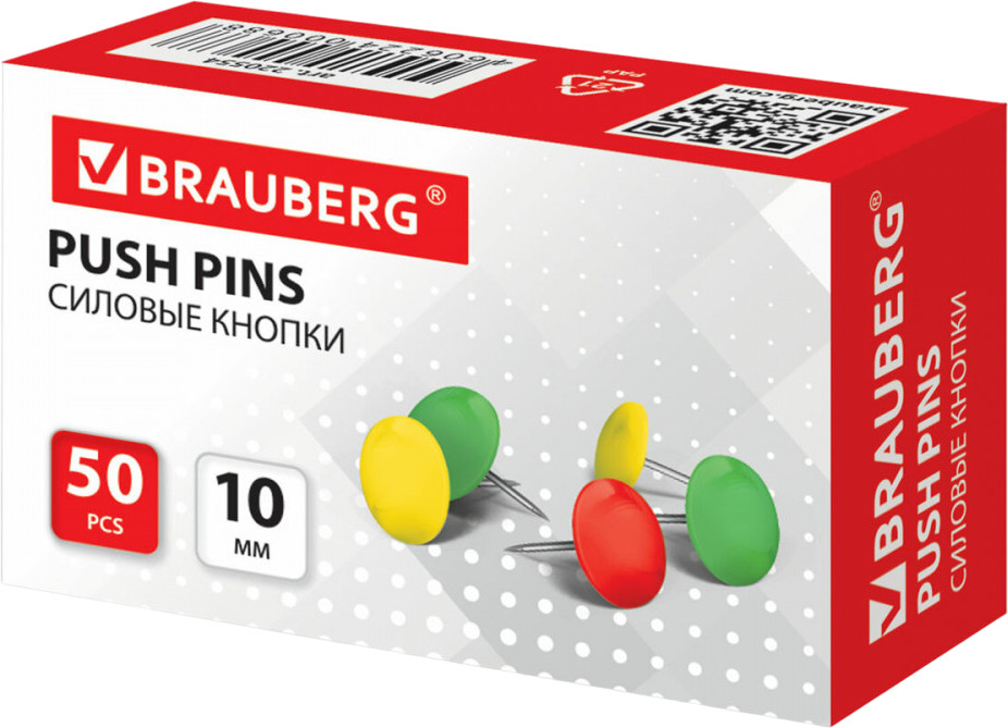 Кнопки канцелярские Brauberg используются для крепления бумаги на пробковые и фетровые доски, а также на другие поверхности. Кнопки со стальной шляпкой с цветным покрытием диаметром 10 мм и стальным острием длиной 9 мм. 50 штук в картонной коробке. Упростите выполнение задач с канцелярскими кнопками! Мгновения достаточно, чтобы закрепить, отметить или соединить. Возьмите под контроль рабочий процесс, ускорьте поиск информации и облегчите выполнение задач. Закажите канцелярские кнопки прямо сейчас и повысьте свою эффективность!