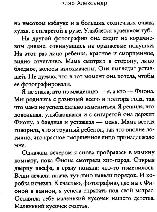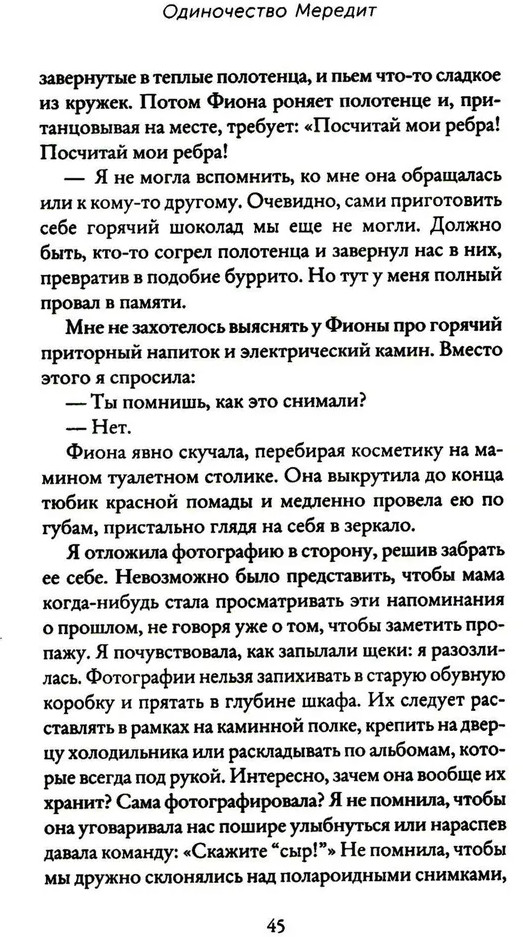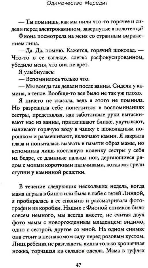 💳 Оплатить за товар можно при получении 🇰🇿 Есть бесплатная доставка по Казахстану от 1 дня 🎁 Копите бонусы с каждой покупки Мередит привыкла быть одна. Она уже три года не выходит из дома, не разговаривает с матерью и старшей сестрой и старается не вспоминать о прошлом. Мередит работает удаленно. Все необходимое заказывает с доставкой. Содержит дом в идеальной чистоте. Вкусно и много готовит. Читает, смотрит старые фильмы, собирает пазлы, любуется вишневым деревом в соседском дворе. На Рождество наряжает елку и кладет под нее подарки. Мередит не чувствует себя одинокой. У нее есть подруга Сэди, которая приезжает в гости с детьми и рассказывает о своей бурной личной жизни. Есть чудесный рыжий кот Фред, который уютно сворачивается клубком на коленях хозяйки. Есть даже психолог, которая раз в неделю дает ей странные «домашние задания». Мередит не намерена ничего менять, ведь перемены еще ни разу не принесли ей счастья. Но скоро в ее жизни появятся люди, планы и надежды, ради которых она все же попробует выйти из дома. |