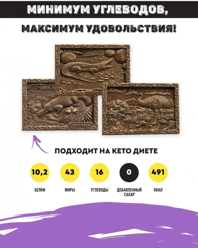 Multibar Шоколад молочный без сахара «Коала»В данный момент этот товар отсутствует в продаже. Возможно, у нас найдется аналогичный или похожий товар здесь. Серия: Австралийская коллекция Низкокалорийный шоколад Multibar изготовлен без сахара. Кондитерская фабрика использует натуральный сахарозаменитель аллюлозу при производстве фигурных бельгийских плиток. Такое сладкое молочное лакомство - отличный выбор для детей и взрослых, подходит для тех, кто соблюдает кето диету и пп. Диетический шоколад станет прекрасным подарком на день рождения, новый год и любой другой праздник. |