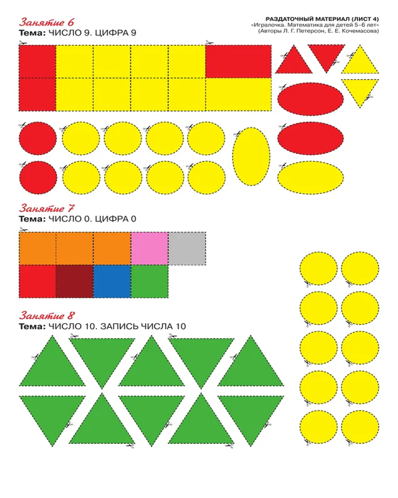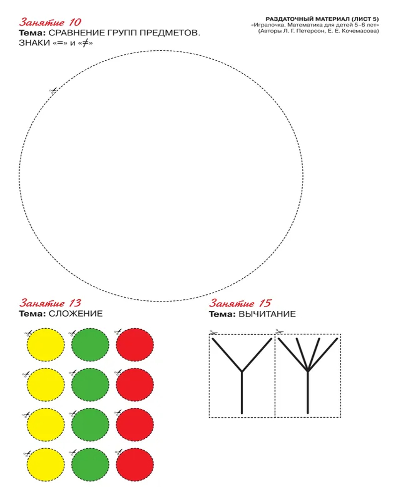 Игралочка — ступенька к школе. Математика для детей 5-6 лет. Раздаточный материалВ данный момент этот товар отсутствует в продаже. Возможно, у нас найдется аналогичный или похожий товар здесь. Серия: Игралочка Раздаточный материал предназначен для использования одним ребенком и расположен на отдельных листах. Вверху каждого листа имеется номер и тема занятия, на котором данный материал используется. К раздаточному материалу прилагаются конверты и лист с обозначением номеров листов и тем занятий. Для удобства пользования раздаточным материалом сначала следует наклеить на каждый конверт номер и тему занятия. После этого, начиная с первого занятия, нужно по пунктирным линиям вырезать карточки, картинки, геометрические фигуры и складывать в соответствующие конверты. На разных занятиях возможно различное использование раздаточного и демонстрационного материала: в одних случаях необходим только раздаточный или только демонстрационный материал, в других — и тот и другой, в третьих — использование данных материалов не запланировано, т. к. дети на занятии пользуются игрушками, красками, соленым тестом и т. п. |