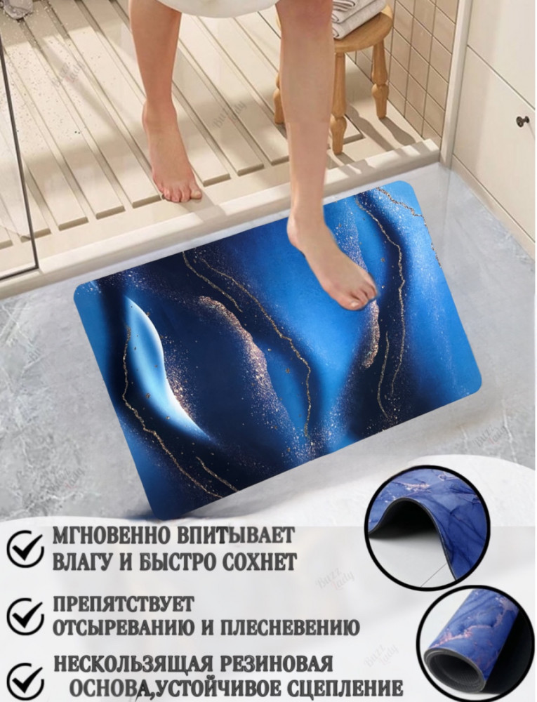 Диатомитовый коврик для ванной комнаты и туалета с мгновенной сушкой имеет размер 90 на 60 см. Качественный, моментально впитывающий влагу, с мягким приятным резиновым основанием. Быстросохнущий и влаговпитывающий подойдет для кухни, бани, сауны. Отлично собирает воду с поверхности влажных ног. Адсорбирующая способность происходит благодаря природному сорбенту из окаменелых водорослей. За счет своего состава большой и нескользящий он обладает удивительной способностью и свойствами поглощать жидкость, а скопившаяся внутри влага мгновенно высыхает через несколько минут.