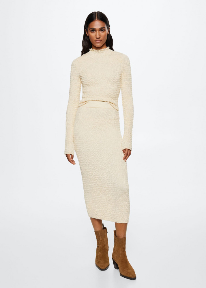 Необычная модель, похож на вязку, но это жатая ткань. Модель укороченная, рукав очень длинный, немного колется. Горловина высокая, если есть зоб, то будет некомфортно. В целом достаточно необычная модель, хорошо смотрится с джинсами -клеш на высокой посадке