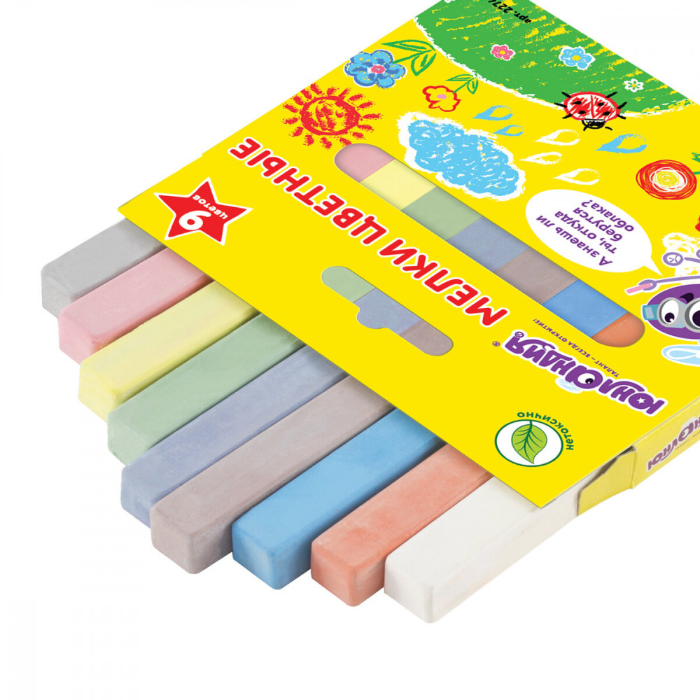 Цветной мел предназначен для письма и рисования на классных и аудиторных досках, а так же на любых шероховатых поверхностях. Изготовлен из высококачественного природного сырья без химических добавок. Не содержит твердых включений и не портит поверхность досок. Благодаря квадратной форме легко ложится в руку. Мел средней твердости. Не оставляет царапин. Легко смывается водой. Длина — 78 мм, диаметр — 13 мм. В наборе 8 цветных мелков и 1 белый. С мелом от Юнландии процесс рисования и школьного обучения станет интересней!
