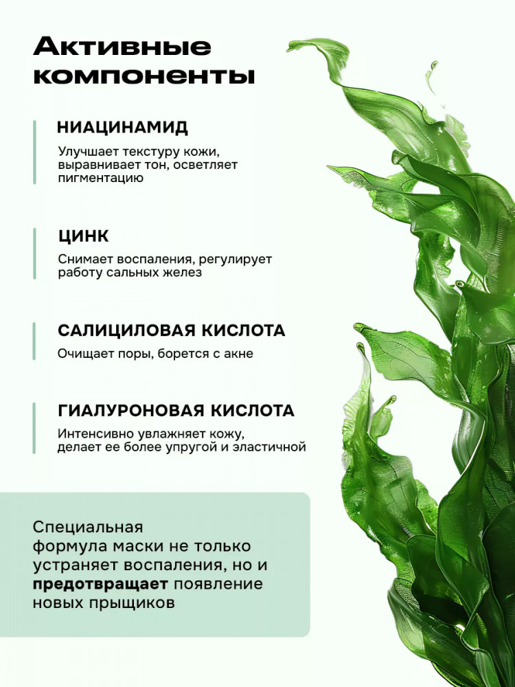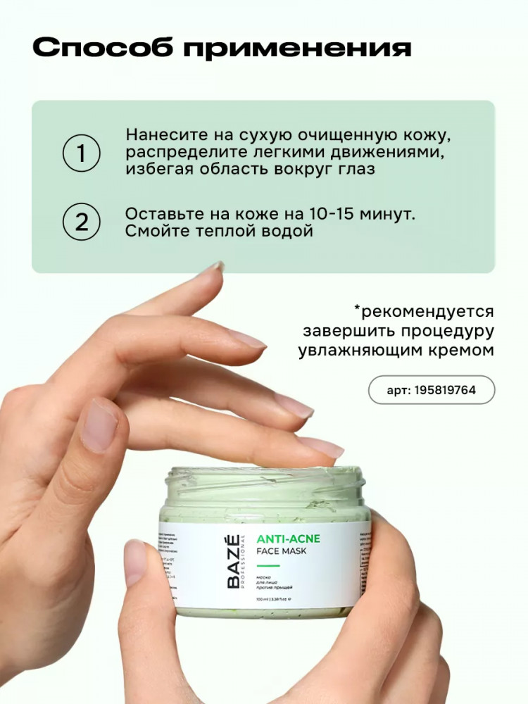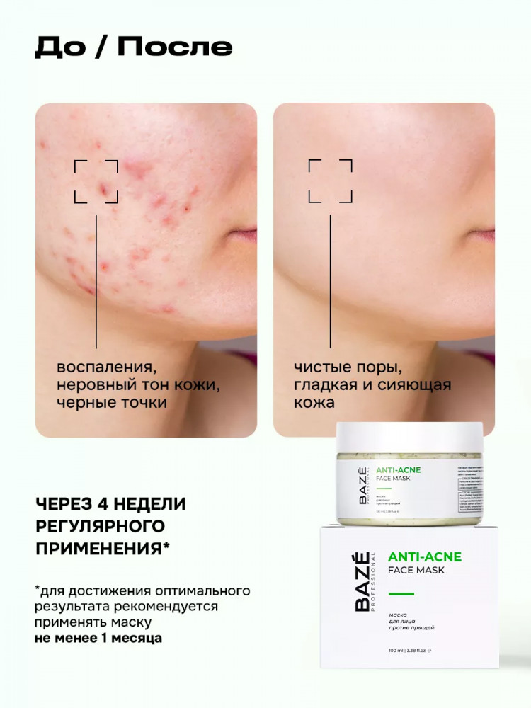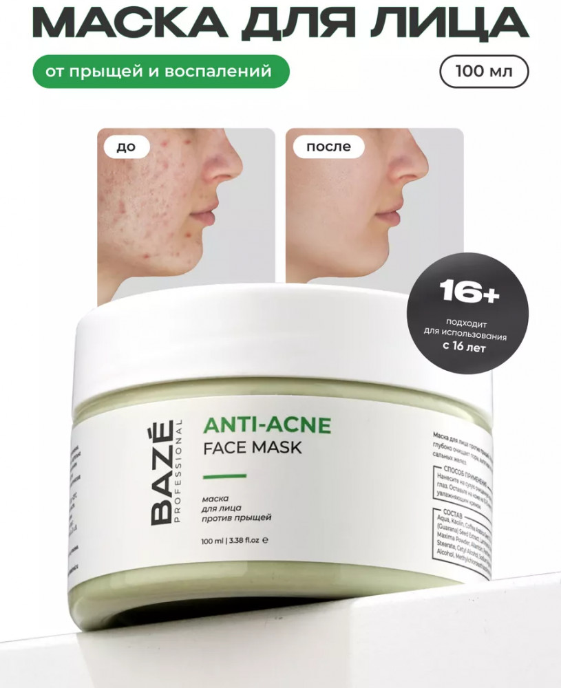 Baze Маска для лица от прыщей «Anti-acne face mask»В данный момент этот товар отсутствует в продаже. Возможно, у нас найдется аналогичный или похожий товар здесь. Серия: Anti-acne Маска для лица против акне — это уходовая косметика, которая помогает бороться с различными несовершенствами кожи и обеспечивает эффективный уход за лицом. Эта маска специально разработана для борьбы с прыщами и черными точками. Она содержит активные ингредиенты, которые помогают очистить поры от излишков кожного сала и грязи, предотвращая появление новых прыщей и сужая поры. Маска также помогает обновить и осветлить кожу лица. Она содержит компоненты, которые стимулируют обновление клеток и помогают снизить пигментацию и пятна на коже. Эта маска является незаменимым средством в вашем регулярном уходе за лицом. Она обеспечивает борьбу с несовершенствами кожи, делая ее чистой, свежей и сияющей. Маска для лица — это косметическое средство, которое помогает вам достичь здоровой и ухоженной кожи. Регулярное использование этой маски поможет вам бороться с черными точками, прыщами и другими несовершенствами, обеспечивая вашей коже чистоту и красоту. Формула на основе пудры спирулины, цинка и салициловой кислоты глубоко очищает поры, вытягивает из них все загрязнения. Подсушивает воспаления, нормализует работу сальных желез. |
