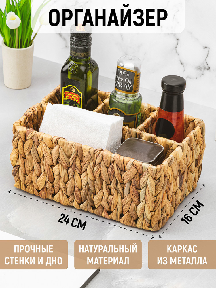 💳 Оплатить за товар можно при получении 🇰🇿 Есть бесплатная доставка по Казахстану от 1 дня 🎁 Копите бонусы с каждой покупки Органайзер ELCASA для салфеток и бутылочек с соусами, специями 24 × 16.5 × 11 см изготовлен из высушенных стеблей и листьев водного гиацинта. Прямоугольная корзина имеет четыре секции и прочный металлический каркас. Внутренние размеры отделений: три по 7 × 7 × 9.5 см и одно — 22 × 7 × 9.5 см. Натуральный цвет изделия подчеркивает органичность и гармонию с окружающей средой. Корзинка с четырьмя отделениями добавит уюта вашему интерьеру. Этот универсальный аксессуар подойдет для хранения кухонных принадлежностей, бутылочек, баночек или ёмкостей. Плетёный контейнер можно использовать для декоративных композиций с цветами. Подойдёт не только для салфеток и столового инвентаря. Можно приспособить под косметику, украшения, предметы рукоделия (пряжи, вязания) и любые мелочи. Поможет создать порядок на кухне, в прихожей или гостиной. Изделия из водного гиацинта не выгорают на солнце. В прихожей в контейнере с несколькими отделениями можно хранить визитки, ключи или духи. Используйте вместо аптечки для таблеток и лекарств. Не рекомендуется применять абразивные моющие средства. Интерьерный плетеный органайзер станет приятным подарком для мамы, бабушки, подруги или сестры на любой праздник. Плетёная коробочка украсит интерьер вашей кухни и поможет создать порядок и уют в любом пространстве! |