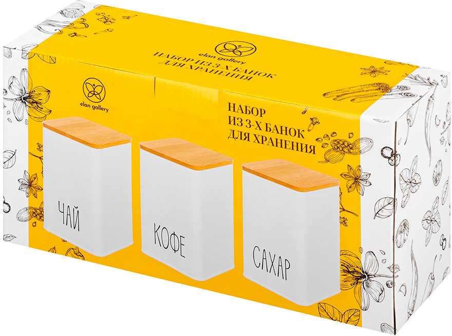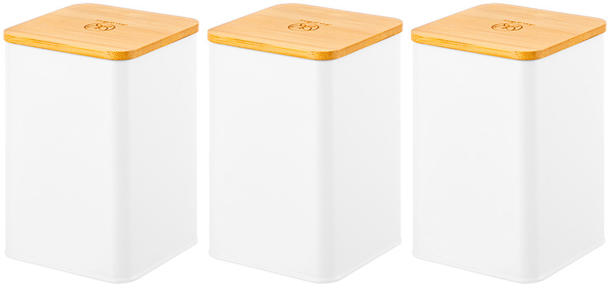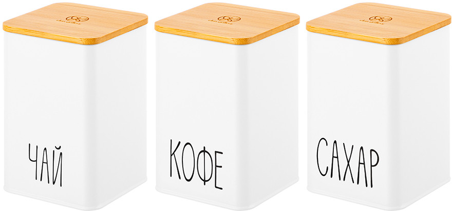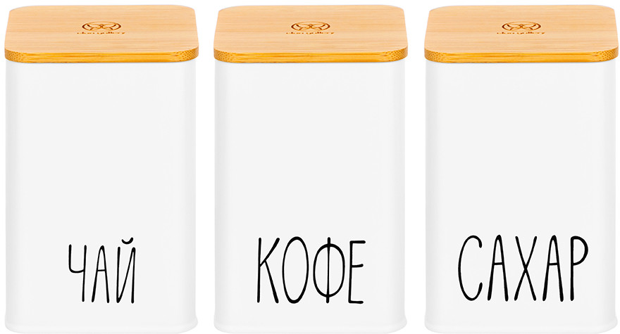 Набор состоит из трёх белых банок для сыпучих продуктов с бамбуковыми крышками. Объём каждой банки — 1.1 литра, размер — 9.5 × 9.5 × 14.5 см. Банки выполнены из высококачественного металла, что обеспечивает прочность и долговечность использования. Украшены надписями «Чай», «Кофе», «Сахар». Бамбуковые крышки позволяют сохранить свежесть и аромат продуктов, а также защищают содержимое от пыли и влаги. Банки для сыпучих продуктов позволят не просто хранить чай, кофе и сахар на вашей кухне, но и станут элементом её декора. Можно использовать для соли, приправ, специй, круп или орехов. Декоративная посуда поможет не только навести порядок на вашей кухне, ее стильный дизайн подойдет к любому интерьеру и поможет создать на кухне уют. Используйте банки не только для сыпучих продуктов, но и конфет, печенья и других сладостей. Кухонные баночки подойдут к интерьеру в любом стиле. Не рекомендуется применять абразивные моющие средства. Не использовать в СВЧ и ПММ. Весь набор выполнен в стильном и элегантном дизайне и может стать прекрасным украшением вашего интерьера. Идеальный вариант подарка для мамы, бабушки, сестры и даже коллеги. Такая посуда станет настоящим украшением вашей кухни и поможет создать в доме порядок и уют!