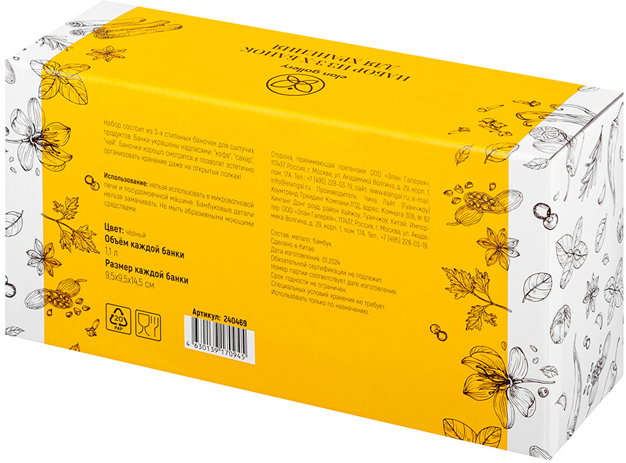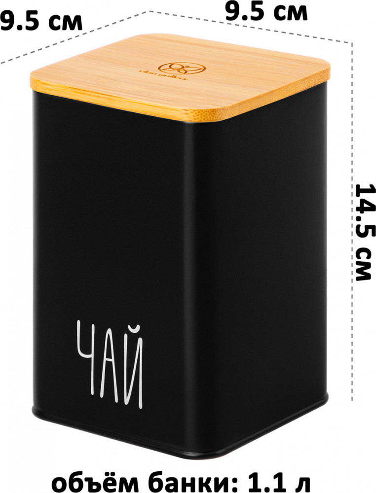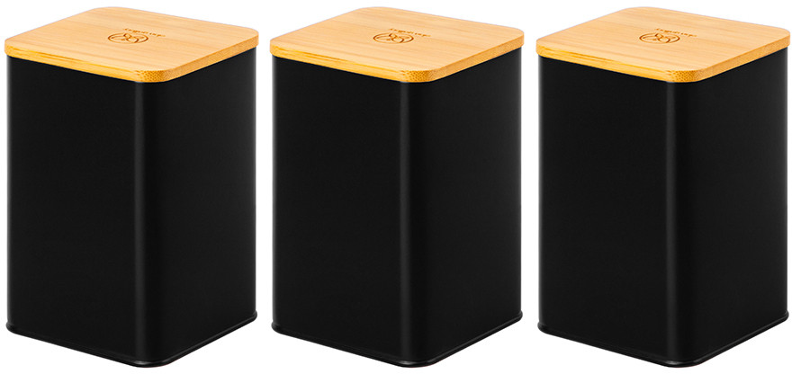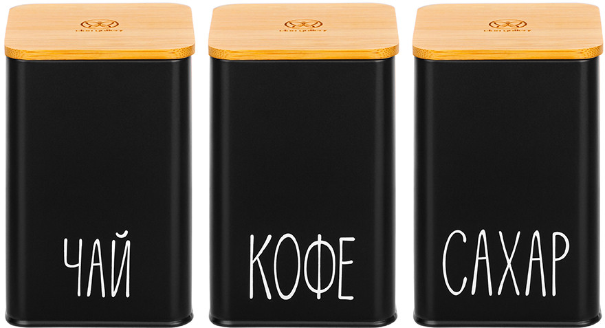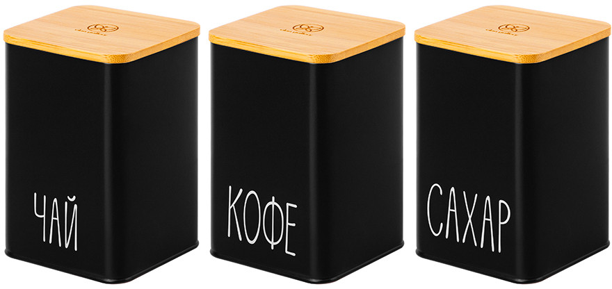 Набор состоит из трёх черных банок для сыпучих продуктов с бамбуковыми крышками. Объём каждой банки — 1.1 литра, размер — 9.5 × 9.5 × 14.5 см. Банки выполнены из высококачественного металла, что обеспечивает прочность и долговечность использования. Украшены надписями «Чай», «Кофе», «Сахар». Бамбуковые крышки позволяют сохранить свежесть и аромат продуктов, а также защищают содержимое от пыли и влаги. Банки для сыпучих продуктов позволят не просто хранить чай, кофе и сахар на вашей кухне, но и станут элементом её декора. Можно использовать для соли, приправ, специй, круп или орехов. Декоративная посуда поможет не только навести порядок на вашей кухне, ее стильный дизайн подойдет к любому интерьеру и поможет создать на кухне уют. Используйте банки не только для сыпучих продуктов, но и конфет, печенья и других сладостей. Кухонные баночки подойдут к интерьеру в любом стиле. Не рекомендуется применять абразивные моющие средства. Не использовать в СВЧ и ПММ. Весь набор выполнен в стильном и элегантном дизайне и может стать прекрасным украшением вашего интерьера. Идеальный вариант подарка для мамы, бабушки, сестры и даже коллеги. Такая посуда станет настоящим украшением вашей кухни и поможет создать в доме порядок и уют!
