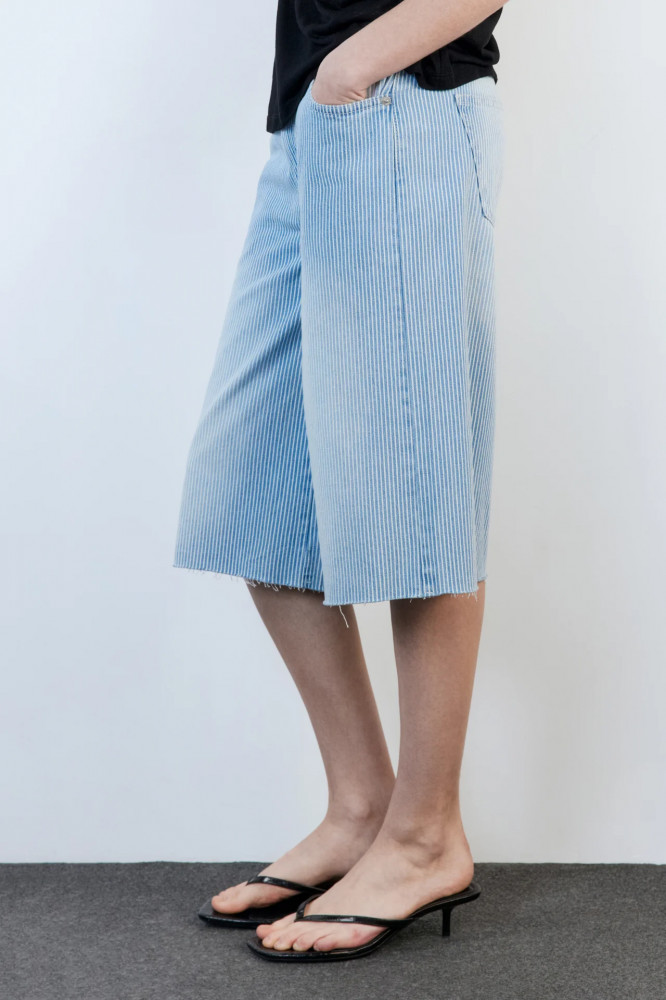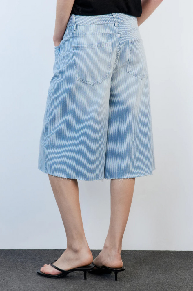 Широкие женские джинсовые бриджи из легкого и очень приятного к телу 100% хлопкового денима. Трендовая низкая посадка подчеркивает фигуру и акцентирует внимание на талии. Короткие широкие штанины ниже колена с обрезанными краями и бахромой. Застежка на молнию и пуговицу спереди, шлевки для ремня. Два боковых кармана с отрезным бочком, два накладных кармана сзади, кармашек для мелочи. Металлические заклепки на карманах спереди.