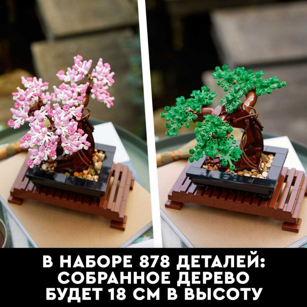 В данный момент этот товар отсутствует в продаже. Возможно, у нас найдется аналогичный или похожий товар здесь. Серия: LEGO Icons Пробудите творческий дух и наслаждайтесь искусством бонсай с этим чудесным деревом бонсай LEGO®. Эта модель для сборки — замечательный способ наполнить свой день покоем и безмятежностью. Отмечайте смену сезонов, меняя розовые цветы на зеленые листья. Дайте волю фантазии и размещайте цветы, чтобы собрать свое собственное уникальное украшение — вместе с горшком и подставкой. Набор «Бонсай LEGO®» (10281) — это уникальный подарок или набор для медитативной сборки для тех, кому нравятся деревья бонсай, растения или творческая сборка из элементов LEGO. Содержит взаимозаменяемые детали, так что вы можете собрать модель с классическими зелеными листьями или ярко-розовыми цветами. Взгляните на симпатичных лягушек, спрятанных в розовых цветах. Прямоугольный цветочный горшок и подставка LEGO® с эффектом дерева позволяют с легкостью демонстрировать собранную модель.