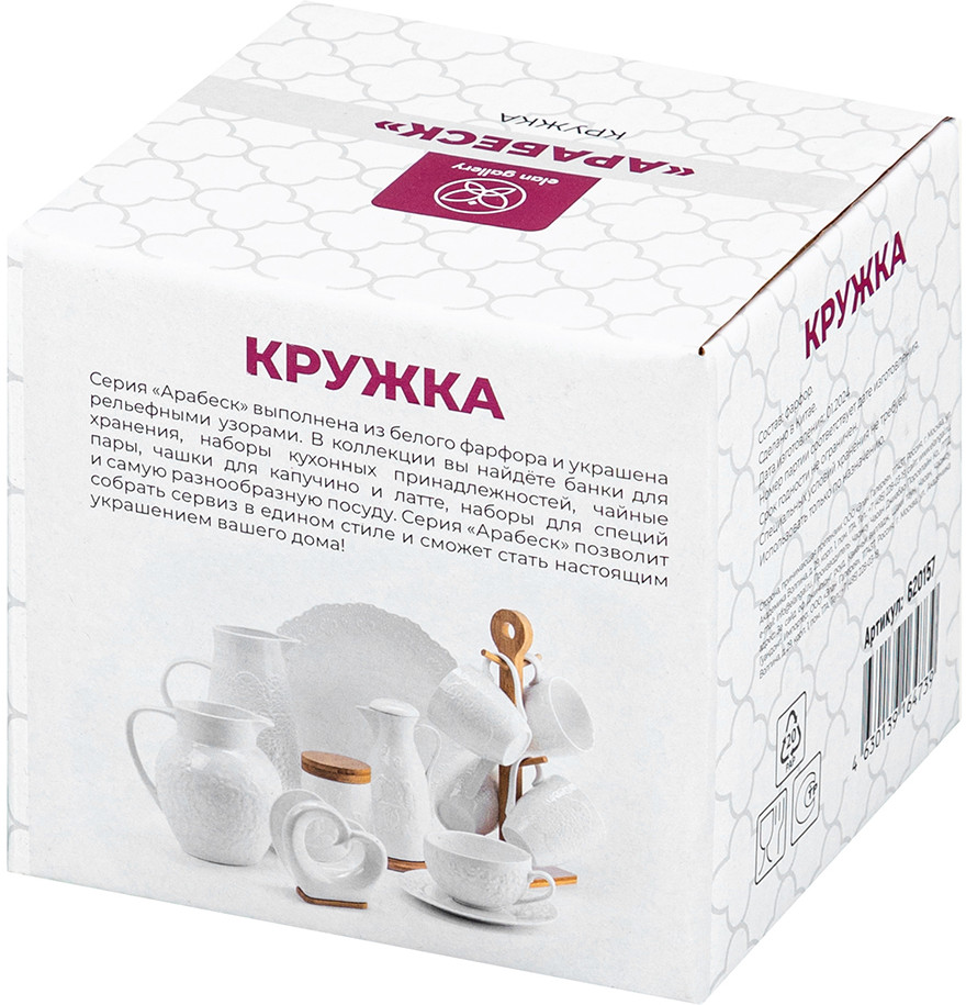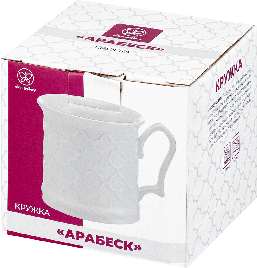 Elan Gallery Кружка «Арабеск»В данный момент этот товар отсутствует в продаже. Возможно, у нас найдется аналогичный или похожий товар здесь. Серия: Арабеск Кружка Elan Gallery «Арабеск» размером 12.5 × 9.7 × 9.3 см и объёмом 400 мл выполнена из белого фарфора с рельефным узором. Кружечка подходит ценителям чая и кофе, которые любят пить из красивой и необычной посуды. Это идеальный вариант для того, чтобы согреться горячим напитком зимой и освежиться прохладным лимонадом летом. Интересная кружечка с удобной ручкой украсит ваш стол своим стильным дизайном как на праздник, так и в будни. Кружка поможет провести множество приятных завтраков с капучино или латте, а также уютных чайных вечеров. Фарфоровые изделия отличаются от керамических повышенной плотностью. Они не впитывают цвет кофе, чая, глинтвейна, других горячих напитков и не деформируются от влаги, чему может быть подвержена керамика. Можно использовать в микроволновой печи и мыть в посудомоечной машине. Поставляется в стильной картонной упаковке. Белая фарфоровая кружка «Арабеск» порадует ваших близких на любой праздник или станет настоящим украшением вашей кухни! |