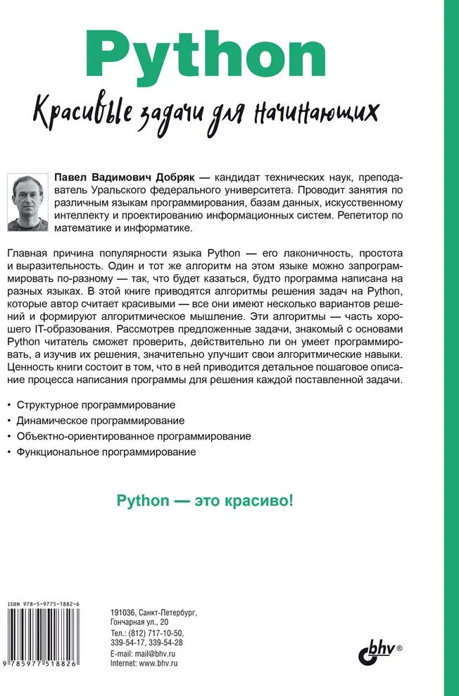 💳 Оплатить за товар можно при получении 🇰🇿 Есть бесплатная доставка по Казахстану от 1 дня 🎁 Копите бонусы с каждой покупки Серия: Для начинающих В книге приведены примеры решения различных практических задач на языке Python и предложено детальное пошаговое описание процесса написания программы для каждой из них. Подобраны задачи, которые имеют несколько вариантов решений и формируют алгоритмическое мышление. Показаны основы структурного, динамического, объектно-ориентированного, функционального программирования. Приведены способы работы с функциями, алгоритмы поиска в длину, в ширину, бэктрекинга, рекурсии. Материал расположен по возрастанию сложности, код программ снабжен комментариями, разъясняющими все языковые конструкции Python. |
