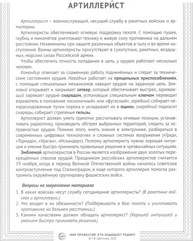 Мир профессий. Кто защищает Родину. Учебно-методическое пособиеВ данный момент этот товар отсутствует в продаже. Возможно, у нас найдется аналогичный или похожий товар здесь. Серия: Мир профессий Издательство «Сфера» представляет комплект серии «Мир профессий» под названием «Кто защищает Родину». Он состоит из 12 цветных демонстрационных картинок и адресован детям и их родителям, желающим познакомиться с современными военными профессиями, узнать много интересного из жизни военнослужащих разных родов войск. На лицевой стороне каждой картинки даётся цветное изображение военнослужащего определённой военной специальности, на обратной — подробное описание, из которого дети узнают, какой техникой и каким оборудованием пользуется каждый военный. Для лучшего закрепления материала приводятся вопросы по каждой теме. Дополнительно в комплект входят 20 разрезных мини-карточек с изображением военного оборудования и заданиями на обороте. Комплект подходит для индивидуальной и групповой работы, может использоваться на тематических викторинах и вечерах. |