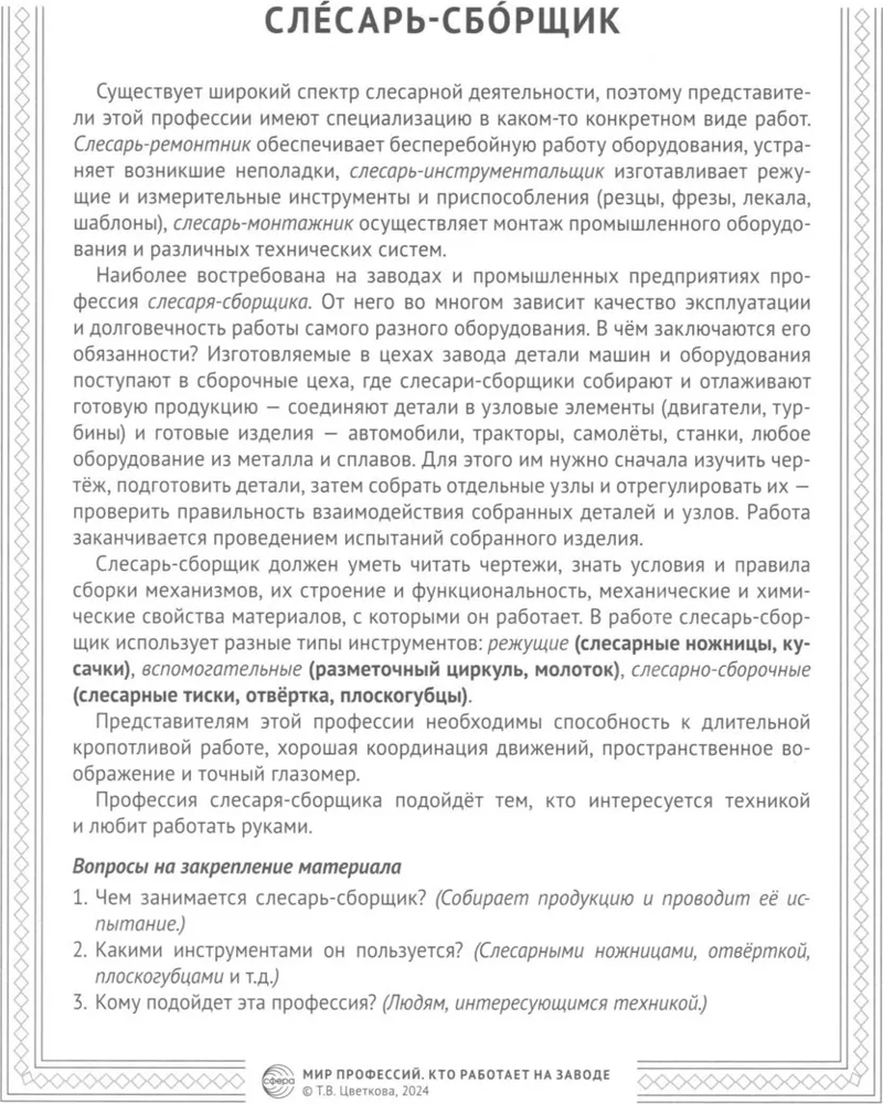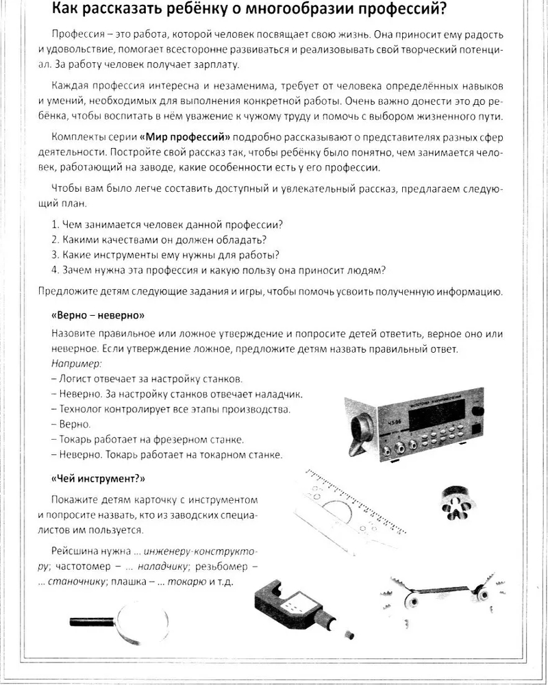 Мир профессий. Кто работает на заводе. Учебно-методическое пособиеВ данный момент этот товар отсутствует в продаже. Возможно, у нас найдется аналогичный или похожий товар здесь. Серия: Мир профессий Издательство «Сфера» представляет комплект серии «Мир профессий» под названием «Кто работает на заводе». Он состоит из 12 цветных демонстрационных картинок и адресован детям и их родителям, желающим познакомиться с людьми, работающими на современном заводе, узнать много интересного и поучительного об их специальности и особенностях профессии. На лицевой стороне каждой картинки даётся цветное изображение представителя определённой профессии, на обратной — подробное описание, из которого дети узнают, какими инструментами пользуется каждый специалист. Для лучшего закрепления материала приводятся вопросы по каждой теме. Дополнительно в комплект входят 20 разрезных мини-карточек с изображением инструментов и оборудования и заданиями на обороте. Комплект подходит для индивидуальной и групповой работы, может использоваться на тематических викторинах, посвящённых различным профессиям. |