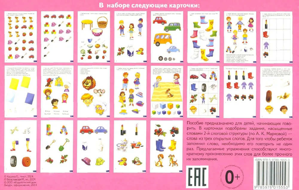 Играй и говори! Трехсложные слова из открытых слоговВ данный момент этот товар отсутствует в продаже. Возможно, у нас найдется аналогичный или похожий товар здесь. Пособие предназначено для детей, начинающих говорить. В карточках подобраны задания, насыщенные словами 2-й слоговой структуры (по А. К. Марковой) — слова из трех открытых слогов. Для того чтобы ребенок запомнил слово, необходимо его повторить не один раз. Предлагаемые упражнения способствуют многократному произнесению этих слов для более прочного их запоминания. В брошюре 21 карточка. |