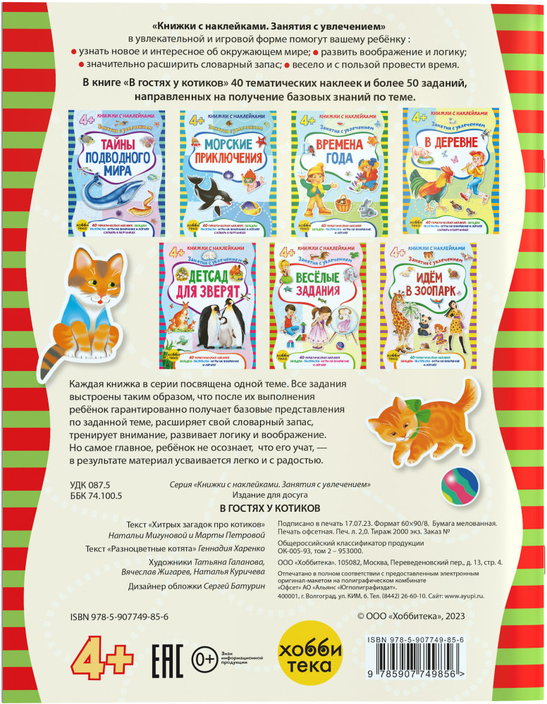 💳 Оплатить за товар можно при получении 🇰🇿 Есть бесплатная доставка по Казахстану от 1 дня 🎁 Копите бонусы с каждой покупки Серия: Книжки с наклейками. Занятия с увлечением В увлекательной и игровой форме наша книга поможет вашему ребёнку узнать новое и интересное об окружающем мире, развить воображение и логику, расширить словарный запас, весело и с пользой провести время. В книге 40 тематических наклеек и более 50 заданий (загадки, раскраски, игры на внимание и логику, словарь в картинках), направленных на получение базовых знаний по теме. Чтобы у малыша выработать усидчивость, его нужно заинтересовать. С этой задачей прекрасно справляется наша книга, настоящая маленькая энциклопедия, которая с помощью наклеек в очень наглядной и увлекательной форме расскажет про наших милых и любимых котиков, таких забавных, озорных и веселых. Дети узнают как поют котики, какого они бывают цвета, как играют, что любят поесть. А разнообразные дополнительные задания, несомненно, поддержат интерес ребёнка к занятиям с книжкой. |