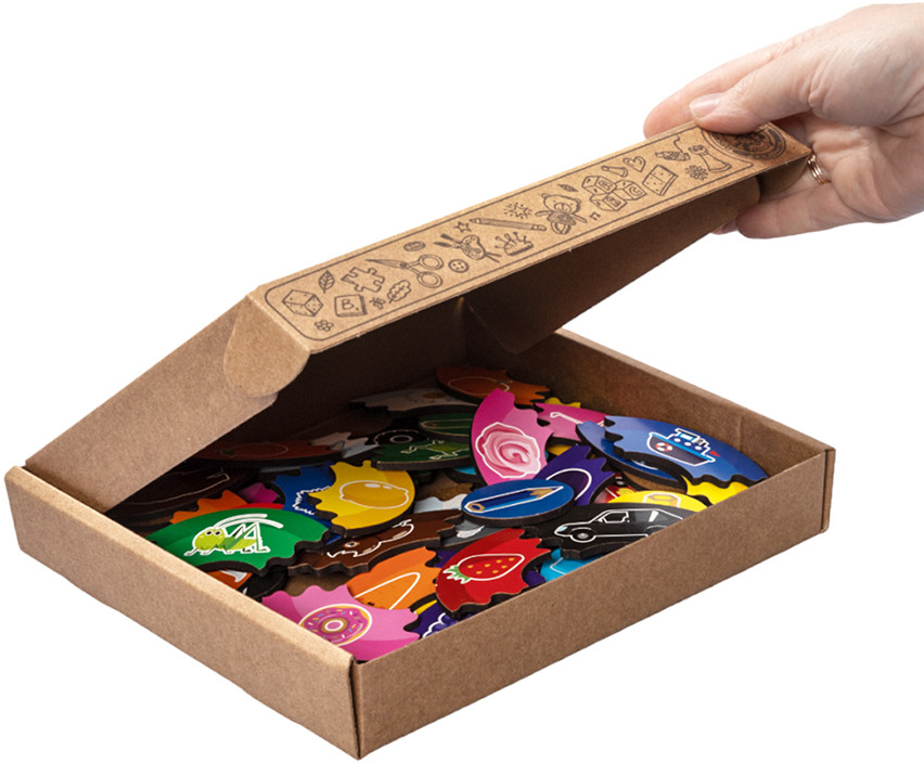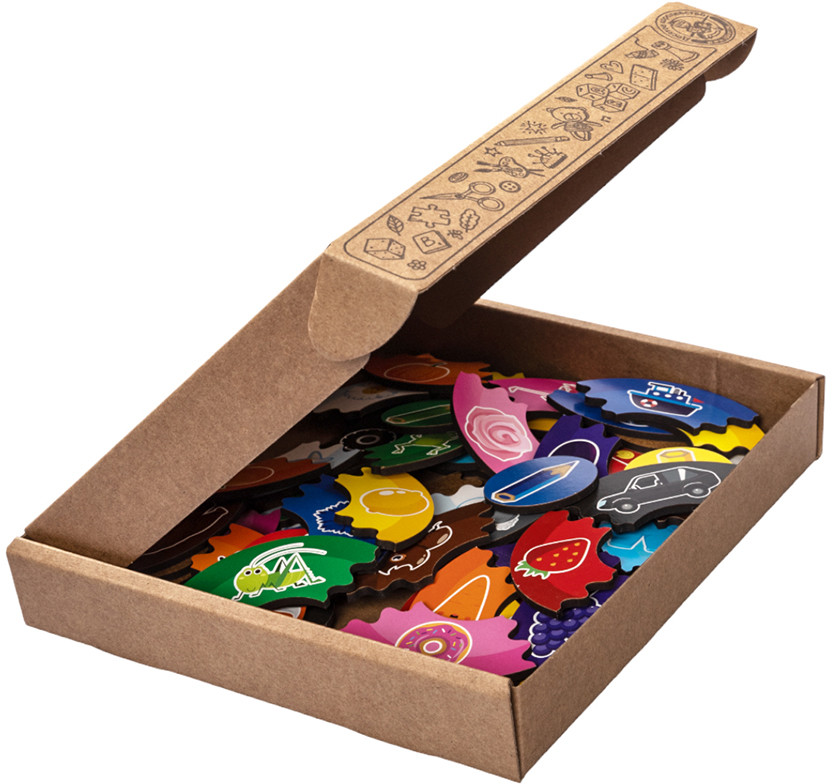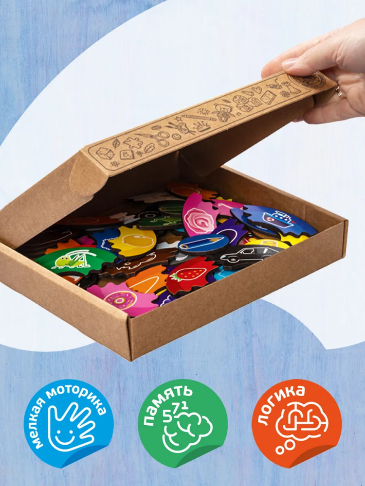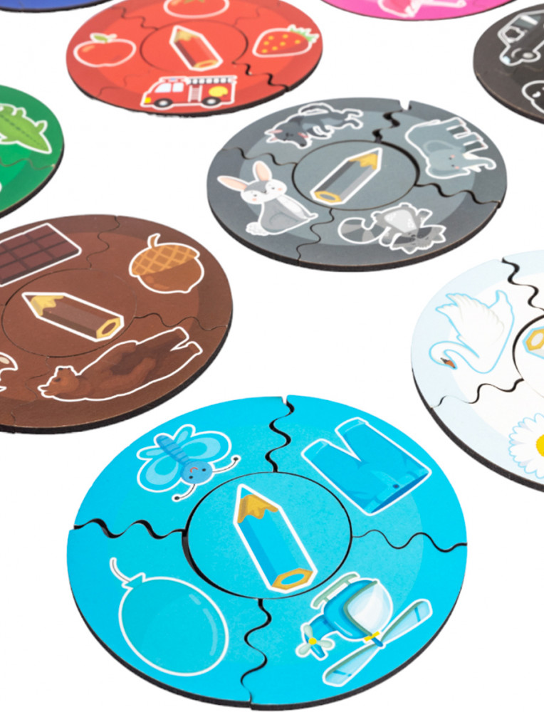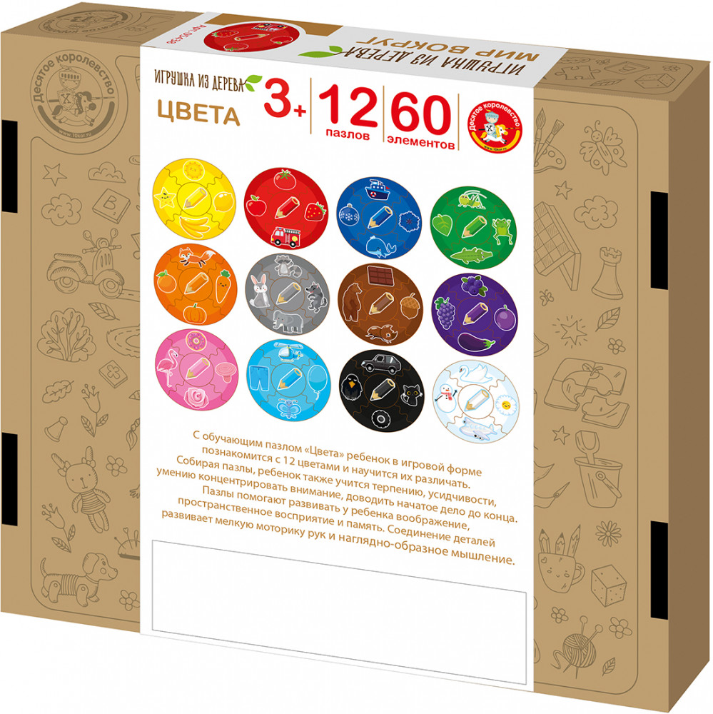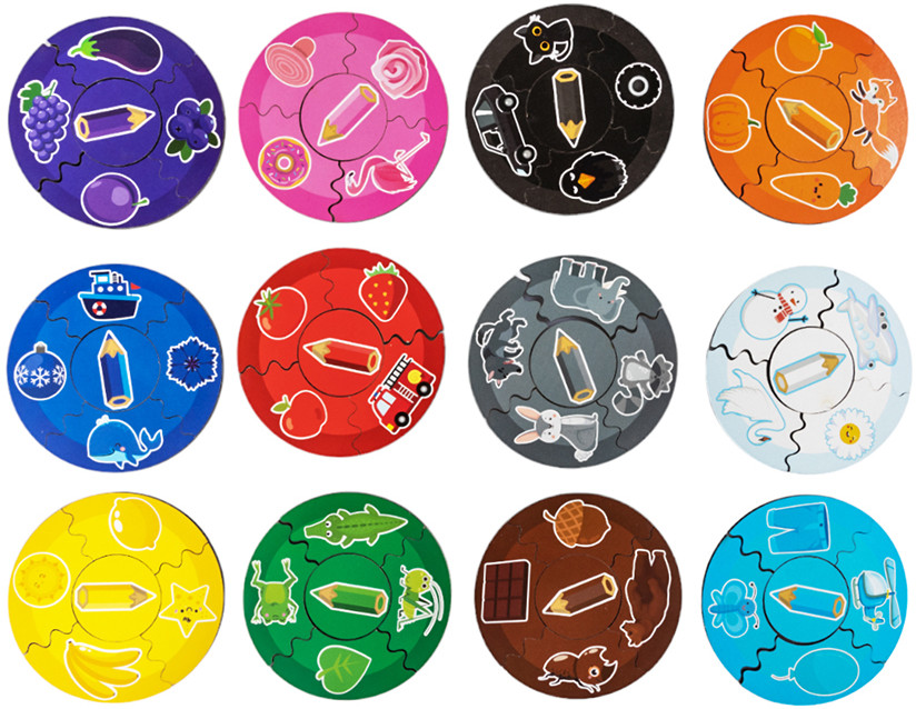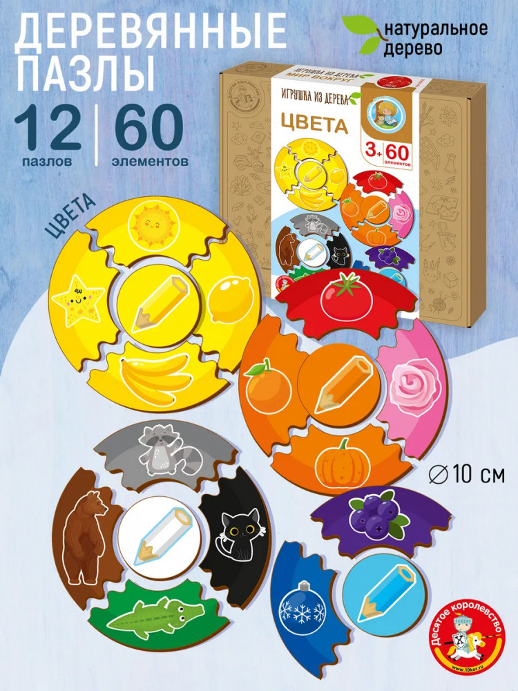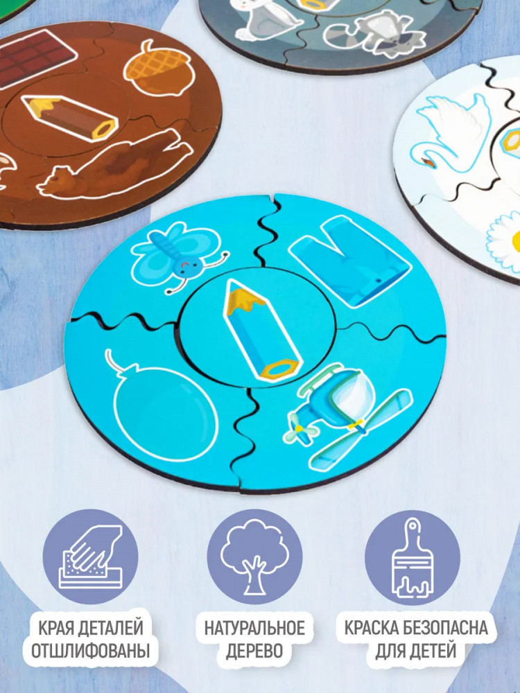 Комплектация: 12 пазлов из древесного материала из 5 элементов каждый. Диаметр собранного пазла 10 см.
