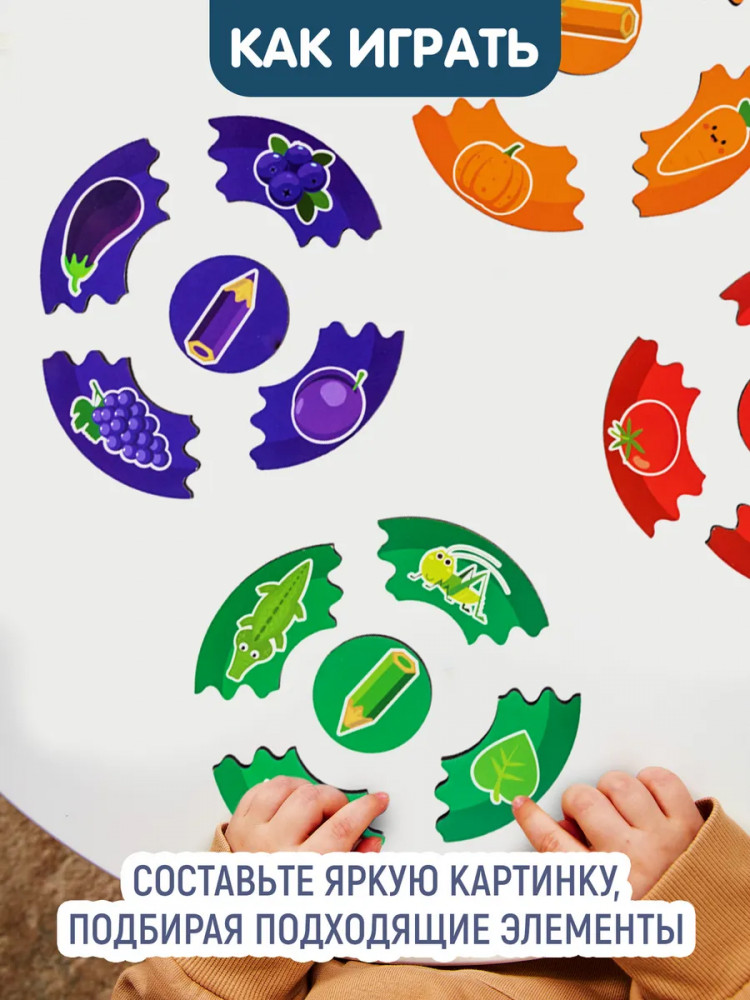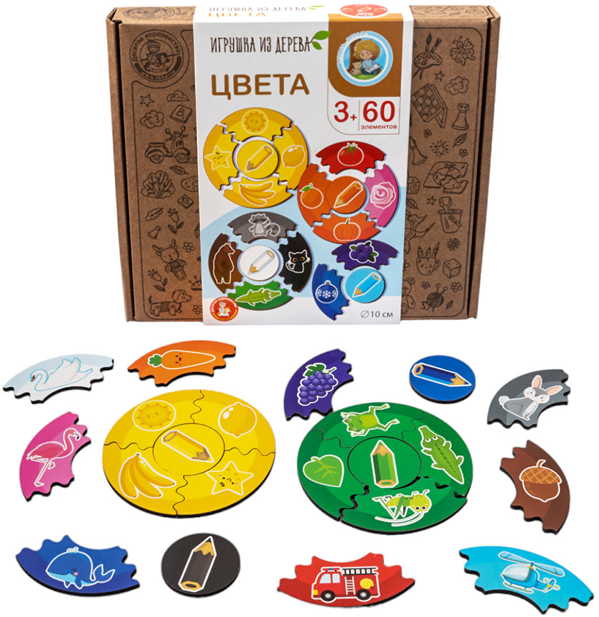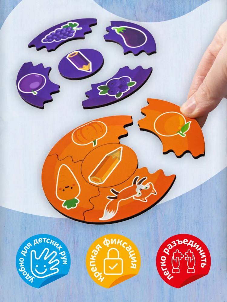 Пазлы изготовлены из древесного материала. Толщина всех элементов около 3 мм. Края закруглены и тщательно обработаны. Все материалы, использованные для изготовления данной игрушки, проверены и имеют сертификаты соответствия. Деревянные пазлы для детей «Мои первые пазлы. Цвета» помогают развивать у ребенка логическое мышление, память. Соединяя части изображения, ребёнок ищет соответствие между цветами, учит названия цветов и изображенных предметов, подбирает подходящие элементы и складывает яркую картинку. В процессе игры ребенок учится терпению, усидчивости, умению концентрировать внимание, доводить начатое дело до конца. Соединение деталей пазла развивает мелкую моторику рук и образное мышление.
