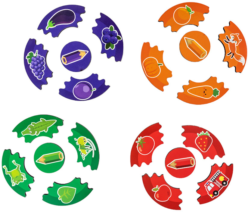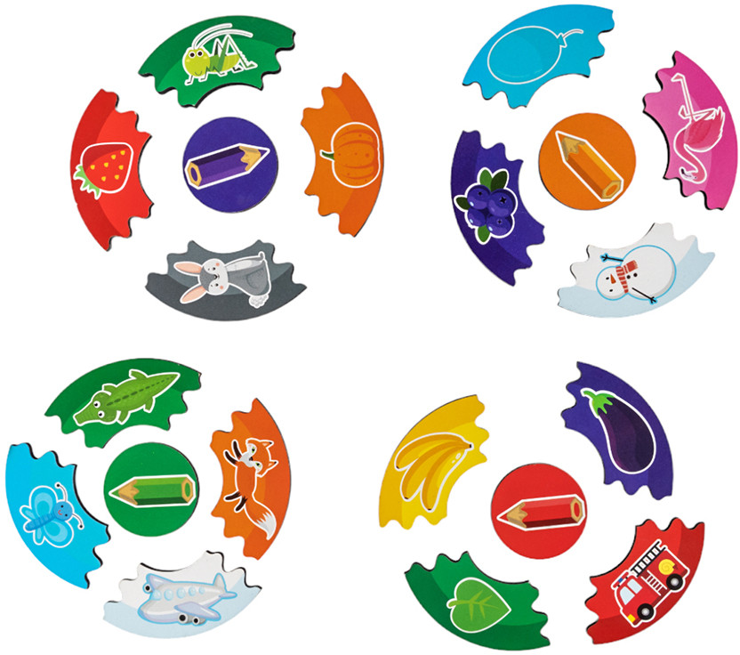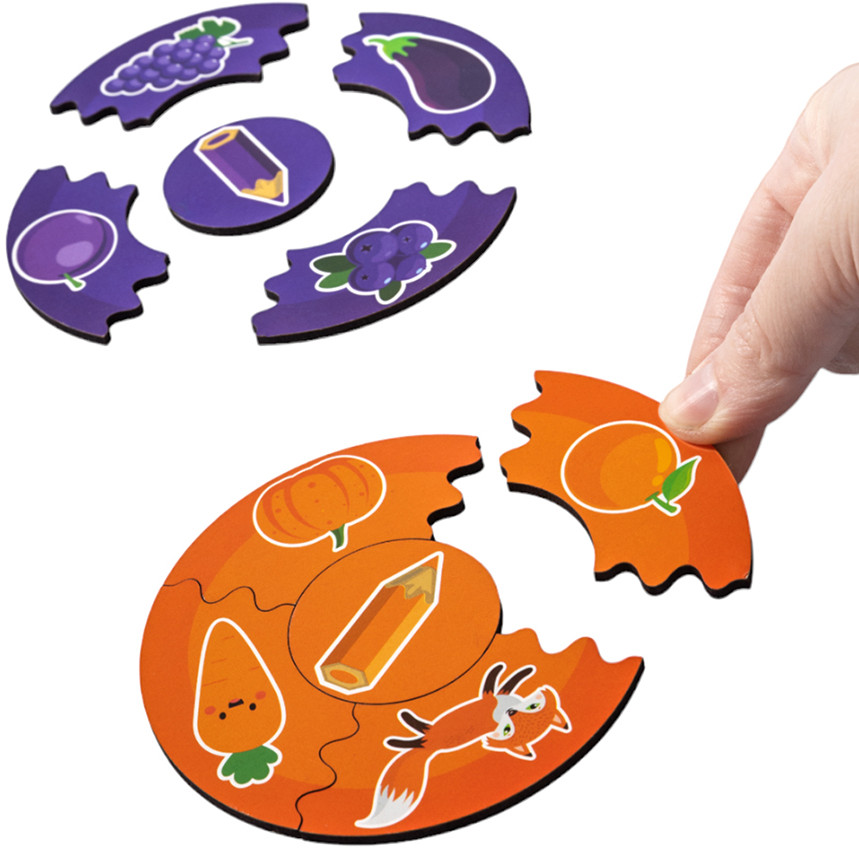 Объясните ребенку принцип сборки пазла. Выберете центральный пазл с изображением карандаша определенного цвета. К нему нужно подобрать фрагменты подходящего цвета. Например, звездочка, солнышко, лимон и бананы желтого цвета. Устанавливаем эти элементы пазла вокруг пазла с желтым карандашом.