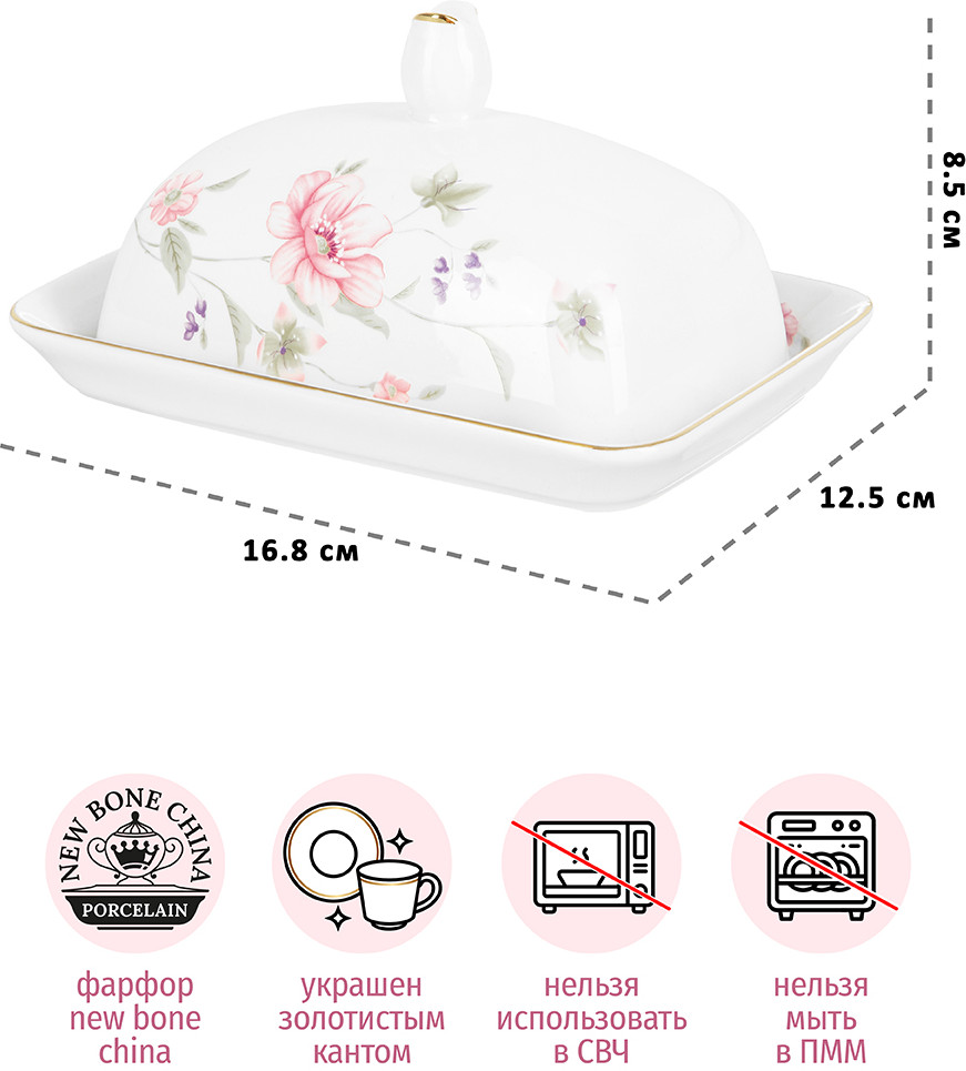 Elan Gallery Масленка «Диана»красота удобство компактность В данный момент этот товар отсутствует в продаже. Возможно, у нас найдется аналогичный или похожий товар здесь. Серия: Диана Масленка Elan Gallery «Диана» выполнена из фарфора. Размер с закрытой крышкой — 16.8 × 12.5 × 8.5 см, высота без крышки — 2 см. Украшена рисунком с розовыми цветами и золотистым кантом по краю тарелочки. Позволит эстетично подавать масло на стол — идеально для завтрака или чаепития! При хранении в холодильнике масло не будет впитывать запахи других продуктов благодаря фарфоровой крышке. Фарфор не впитывает цвет и запах продуктов, чему может быть подвержена керамическая посуда. Масленка сохранит натуральный запах масла. Можно использовать для хранения сыра или долек лимона. Не рекомендуется применять абразивные моющие средства. Из-за золотой каймы нельзя использовать в микроволновой печи и посудомоечной машине. Поставляется в цветной картонной упаковке (коробке). Подарите посуду из фарфора маме, бабушке, подруге, коллеге или сестре. Её красивый дизайн и функциональность понравятся каждому, а высокое качество фарфора обеспечит долговечность этого подарка. Масленка с изображением розовых и фиолетовых цветочков «Диана» станет незаменимым помощником для организации теплого семейного чаепития как на праздник, так и в будни! |