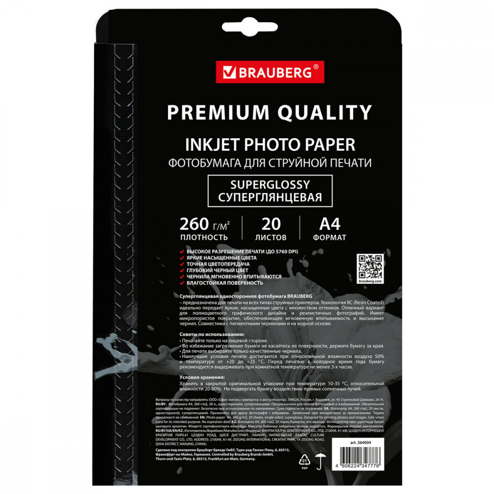 💳 Оплатить за товар можно при получении 🇰🇿 Есть бесплатная доставка по Казахстану от 1 дня 🎁 Копите бонусы с каждой покупки Суперглянцевая односторонняя фотобумага премиум качества Brauberg обеспечивает студийное качество фотографий. Предназначена для печати на всех типах струйных принтеров. Имеет микропористое покрытие, обеспечивающее мгновенную впитываемость и высыхание чернил. Технология RC идеально передает яркие, насыщенные цвета с множеством оттенков. Формат фотобумаги — A4, плотность — 260 г/м2, 20 листов в картонной упаковке с европодвесом. |