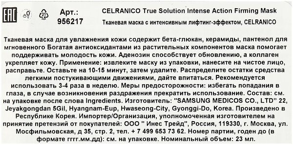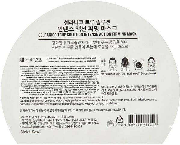 Celranico Маска для лица c интенсивным лифтинг-эффектом «True Solution Intense Action Firming Mask»В данный момент этот товар отсутствует в продаже. Возможно, у нас найдется аналогичный или похожий товар здесь. Тканевая маска для увлажнения кожи содержит бета-глюкан, керамиды, пантенол. Богатая антиоксидантами из растительных компонентов, маска помогает поддерживать молодость кожи. Аденозин способствует обновлению, а коллаген укрепляет кожу. |