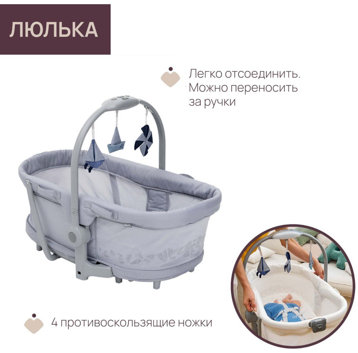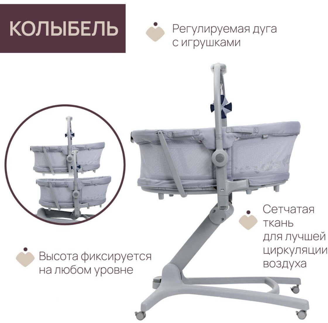 • Сетчатая поверхность по периметру кроватки помогает свободно циркулировать воздуху.