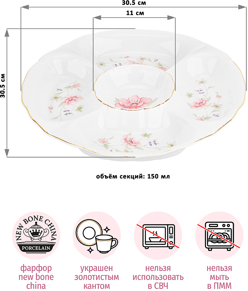 💳 Оплатить за товар можно при получении 🇰🇿 Есть бесплатная доставка по Казахстану от 1 дня 🎁 Копите бонусы с каждой покупки Серия: Диана Менажница Elan Gallery «Диана» размером 30.5 × 30.5 × 4 см изготовлена из фарфора. Сервировочное блюдо с изображениями розовых и фиолетовых цветов украшено золотистым кантом. Представляет собой цельную тарелку с пятью секциями. Объём каждой секции — 150 мл. Диаметр центральной секции — 11 см. Менажница подойдет для сервировки и подачи различных закусок: сырной и мясной нарезки, канапе или роллов. Сервировочное блюдо пригодится, чтобы создать идеальную атмосферу для приема гостей или романтического ужина дома. Благодаря отдельным секциям вы можете использовать одну и ту же тарелочку для солений, оливок, сыра и колбасы. Такой подход к сервировке позволит сэкономить место на вашем столе. Эргономичная форма менажницы позволит разместить разные закуски или сладости. Положите в неё свежие овощи, фрукты или ягоды. Фарфоровая посуда отличается от керамической повышенной плотностью. Фарфор не впитывает цвет продуктов и не деформируется от влаги, чему может быть подвержена керамика. Не рекомендуется применять абразивные моющие средства. Из-за золотого окаймления нельзя использовать в микроволновой печи и посудомоечной машине. Поставляется в стильной картонной упаковке. Такой подарок оценит любая хозяйка, которая ценит изящную сервировку. Посуда серии «Диана» станет украшением вашего стола как в будни, так и на праздник! |