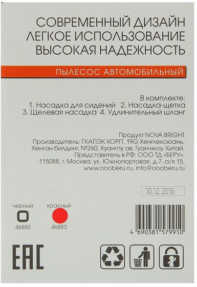 Nova Bright Пылесос для автомобиляВ данный момент этот товар отсутствует в продаже. Возможно, у нас найдется аналогичный или похожий товар здесь. Пылесос Nova Bright, для сухой и влажной уборки, 100 Вт, 12 В, красный. Не секрет, что машина давно уже перестала восприниматься как просто средство передвижения, и водители покупают всё лучшее для своих железных коней. Пылесос Nova Bright, для сухой и влажной уборки, 100 Вт, 12 В, красный — идеальный выбор, если вы ставите целью и улучшение технических характеристик, и поддержание внешнего вида автомобиля. |
