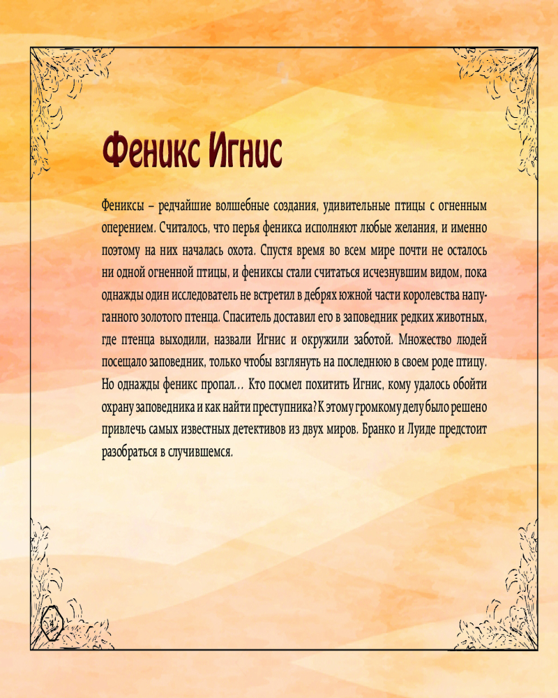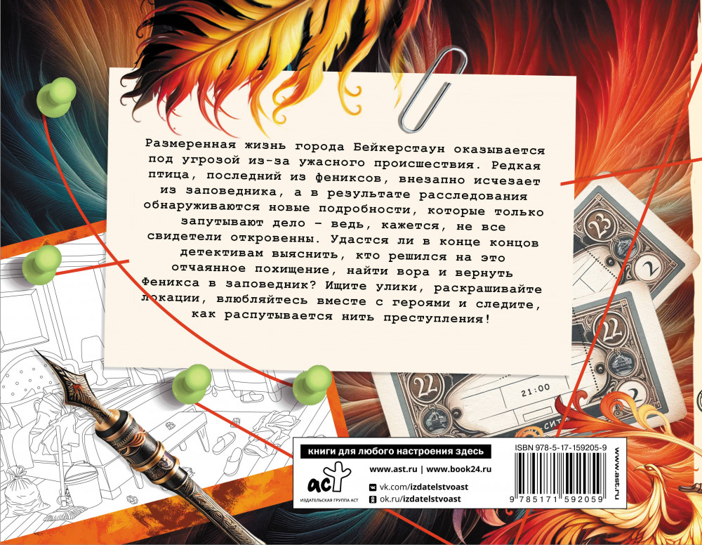 Серия: АртДетектив. Интеллектуальный антистресс В городе Бейкерстаун произошло невообразимое: прямо из заповедника пропал последний феникс, не оставив никаких следов! Кажется, что директор и сотрудники готовы помочь детективам чем угодно, но, может, и им есть, что скрывать? Разгадка одной тайны ведет к обнаружению еще нескольких, показания свидетелей не всегда сходятся, и только настоящие профессионалы способны выяснить, кто же причастен к исчезновению редкой птицы. Собирайте улики, раскрашивайте локации, следуйте за героями и раскрывайте секреты на первый взгляд обычного городка... |