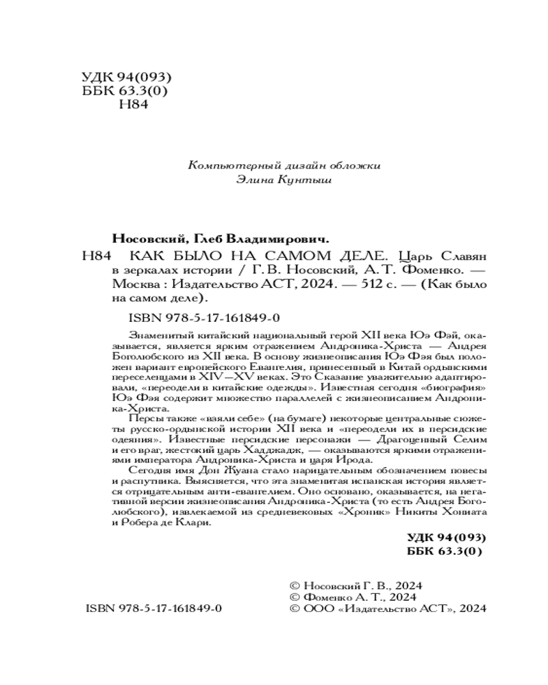 💳 Оплатить за товар можно при получении 🇰🇿 Есть бесплатная доставка по Казахстану от 1 дня 🎁 Копите бонусы с каждой покупки Серия: Как было на самом деле... Знаменитый китайский национальный герой XII века Юэ Фэй, оказывается, является ярким отражением Андроника-Христа — Андрея Боголюбского из XII века. В основу жизнеописания Юэ Фэя был положен вариант европейского Евангелия, принесенный в Китай ордынскими переселенцами в XIV-XV веках. Это Сказание уважительно адаптировали, «переодели в китайские одежды». Известная сегодня «биография» Юэ Фэя содержит множество параллелей с жизнеописанием Андроника-Христа. Персы также «взяли себе» (на бумаге) некоторые центральные сюжеты русско-ордынской истории XII века и «переодели их в персидские одеяния». |