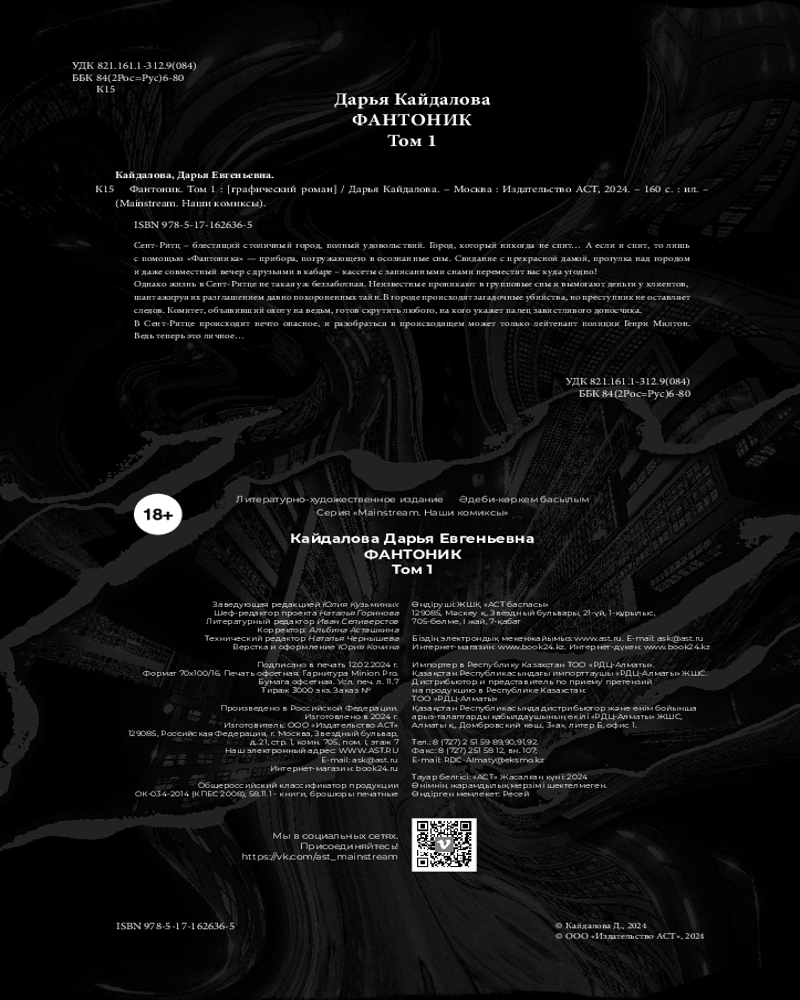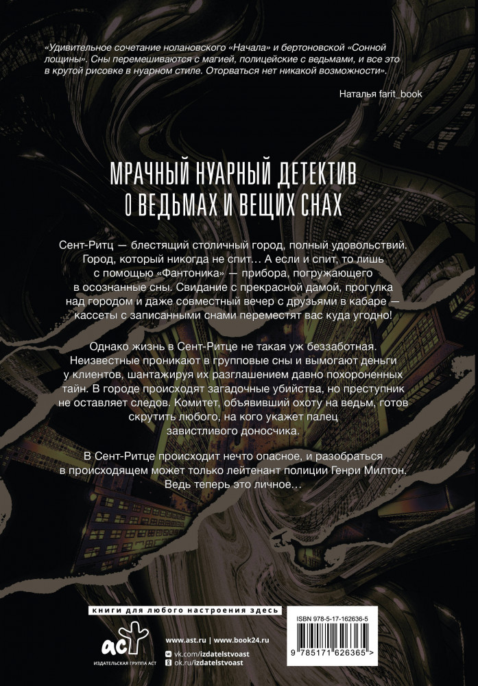 💳 Оплатить за товар можно при получении 🇰🇿 Есть бесплатная доставка по Казахстану 🎁 Копите бонусы с каждой покупки Серия: Мейнстрим. Наши комиксы Сент-Ритц — блестящий столичный город, полный удовольствий. Город, который никогда не спит... А если и спит, то лишь с помощью «Фантоника» — прибора, погружающего в осознанные сны. Свидание с прекрасной дамой, прогулка над городом и даже совместный вечер с друзьями в кабаре — кассеты с записанными снами переместят вас куда угодно! Однако жизнь в Сент-Ритце не такая уж беззаботная. Неизвестные проникают в групповые сны и вымогают деньги у клиентов, шантажируя их разглашением давно похороненных тайн. В городе происходят загадочные убийства, но преступник не оставляет следов. Комитет, объявивший охоту на ведьм, готов скрутить любого, на кого укажет палец завистливого доносчика. В Сент-Ритце происходит нечто опасное, и разобраться в происходящем может только лейтенант полиции Генри Милтон. Ведь теперь это личное... |
