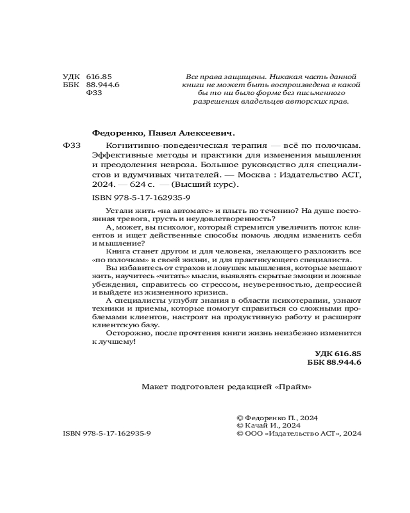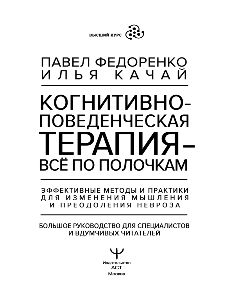Когнитивно-поведенческая терапия — всё по полочкам. Эффективные методы и практики для изменения мышления и преодоления невроза. Большое руководство для специалистов и вдумчивых читателейПавел Алексеевич Федоренко, Илья Качай В данный момент этот товар отсутствует в продаже. Возможно, у нас найдется аналогичный или похожий товар здесь. Серия: Высший курс Авторы бестселлеров по психологии и специалисты в области когнитивно-поведенческой терапии, психологи Павел Федоренко и Илья Качай предлагают изменить жизнь с помощью проверенной действенной методики. Устали жить «на автомате» и плыть по течению? На душе постоянная тревога, грусть и неудовлетворенность? А, может, вы психолог, который стремится увеличить поток клиентов и ищет действенные способы помочь людям изменить себя и мышление? Книга станет другом и для человека, желающего разложить все «по полочкам» в своей жизни, и для практикующего специалиста. Вы избавитесь от страхов и ловушек мышления, которые мешают жить, научитесь «читать» мысли, выявлять скрытые эмоции и ложные убеждения, справитесь со стрессом, неуверенностью, депрессией и выйдете из жизненного кризиса. А специалисты углубят знания в области психотерапии, узнают техники и приемы, которые помогут справиться со сложными проблемами клиентов, настроят на продуктивную работу и расширят клиентскую базу. Осторожно, после прочтения книги жизнь неизбежно изменится к лучшему! |