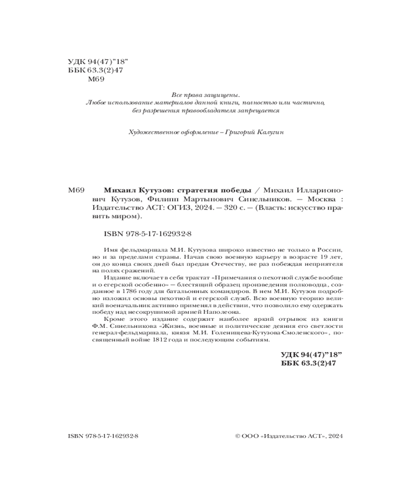 💳 Оплатить за товар можно при получении 🇰🇿 Есть бесплатная доставка по Казахстану от 1 дня 🎁 Копите бонусы с каждой покупки Серия: Власть: искусство править миром Имя фельдмаршала М.И. Кутузова широко известно не только в России, но и за пределами страны. Начав свою военную карьеру в возрасте 19 лет, он до конца своих дней был предан Отечеству, не раз побеждая неприятеля на полях сражений. Издание включает в себя трактат «Примечания о пехотной службе вообще и о егерской особенно» — блестящий образец произведения полководца, созданное в 1786 году для батальонных командиров. В нем М.И. Кутузов подробно изложил основы пехотной и егерской служб. Всю военную теорию великий военачальник активно применял в действии, что позволило ему одержать победу над несокрушимой армией Наполеона. Кроме этого издание содержит наиболее яркий отрывок из книги Ф.М. Синельникова «Жизнь, военные и политические деяния его светлости генерал-фельдмаршала, князя М.И. Голенищева-Кутузова-Смоленского», посвященный войне 1812 года и последующим событиям. |