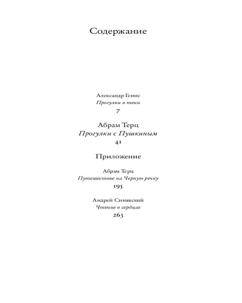 «Прогулки с Пушкиным» — самая известная, вызвавшая наибольшее количество споров книга Андрея Синявского, которую он написал во время заключения в Дубровлаге. В книгу также вошли эссе «Путешествие на Черную речку» и письмо-ответ А.И.Солженицыну «Чтение в сердцах», опубликованные в журнале «Синтаксис». Предисловие Александра Гениса. В оформлении книги использован рисунок Михаила Шемякина.