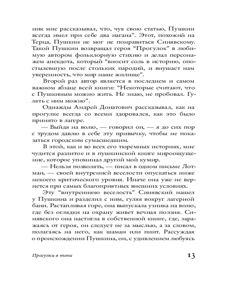 «Прогулки с Пушкиным» — это лирическая проза писателя Абрама Терца, в которой я по-своему пытаюсь объясниться в любви к Пушкину и высказать благодарность его тени, спасавшей меня в лагере», — Андрей Синявский.