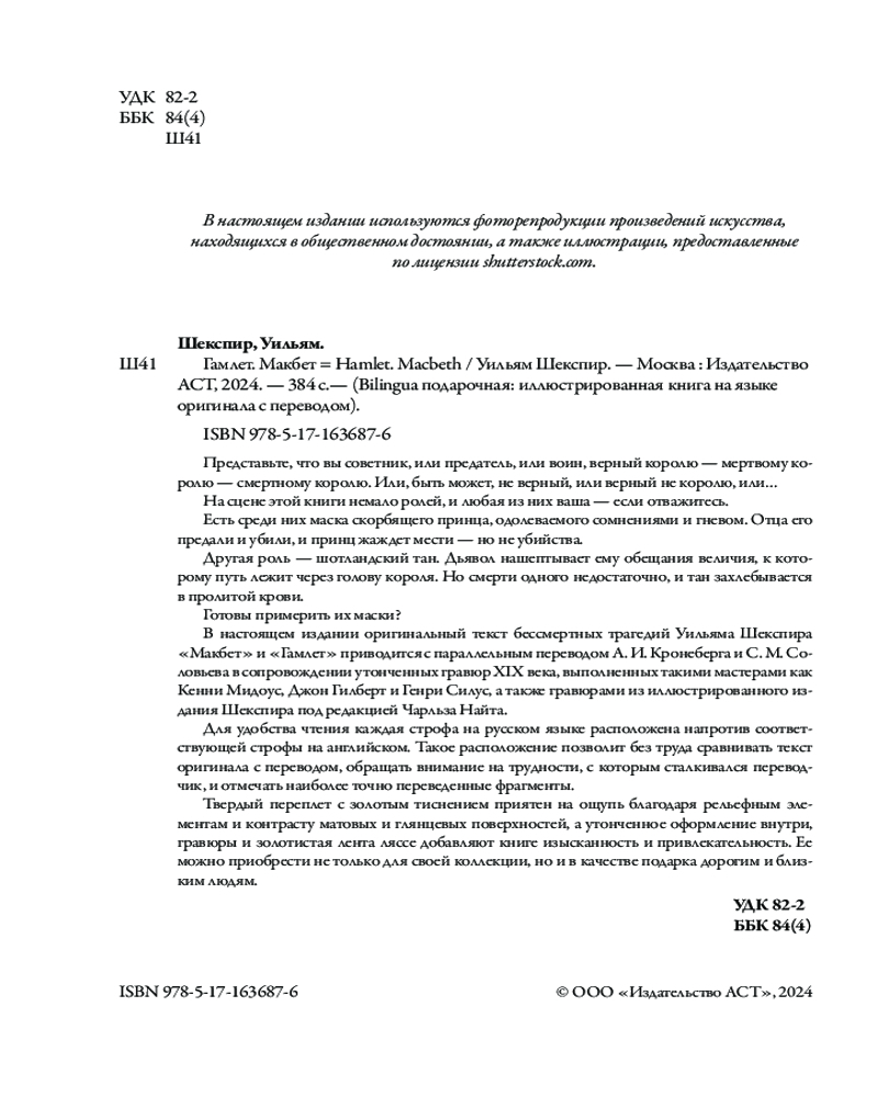 Серия: Bilingua подарочная: иллюстрированная книга на языке оригинала с переводом Представьте, что вы советник, или предатель, или воин, верный королю — мертвому королю — смертному королю. Или, быть может, не верный, или верный не королю, или... На сцене этой книги немало ролей, и любая из них ваша — если отважитесь. Есть среди них маска скорбящего принца, одолеваемого сомнениями и гневом. Отца его предали и убили, и принц жаждет мести — но не убийства. Другая роль — шотландский тан. Дьявол нашептывает ему обещания величия, к которому путь лежит через голову короля. Но смерти одного недостаточно, и тан захлебывается в пролитой крови.