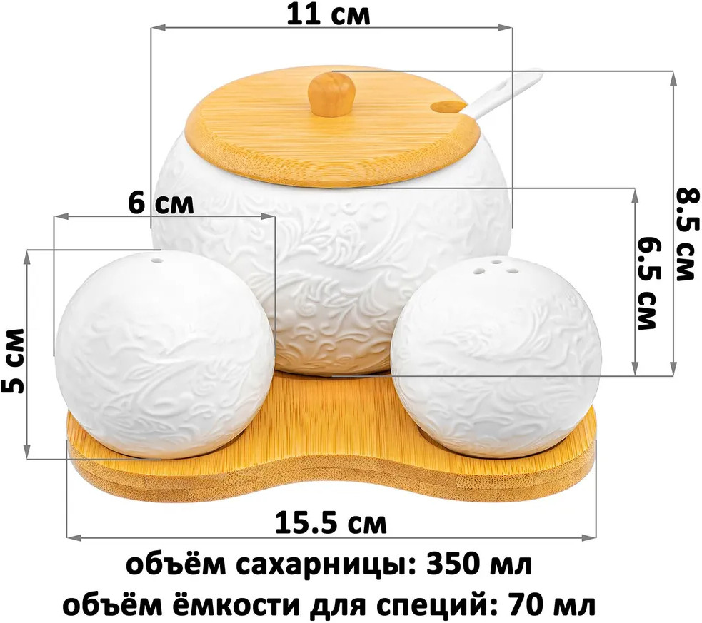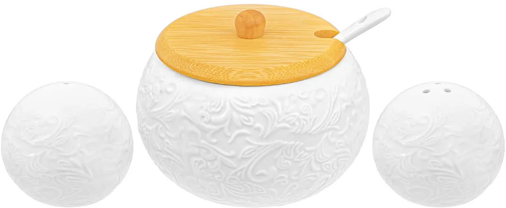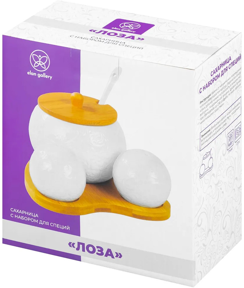 Elan Gallery Набор сервировочный «Лоза»В данный момент этот товар отсутствует в продаже. Возможно, у нас найдется аналогичный или похожий товар здесь. Серия: Лоза Набор Elan Gallery серии «Лоза» состоит из сахарницы объёмом 350 мл, солонки и перечницы на бамбуковой подставке. Размер набора — 15 × 15.5 × 9 см. Сахарница 11 × 11 × 8.5 см имеет крышку из бамбука (высота изделия без крышки — 6,5 см) и фарфоровую ложку в комплекте. Баночка с ложечкой подойдёт не только для хранения сахара, но и мёда, варенья или джема. Размер солонки и перечницы: 6 × 6 × 5 см каждая баночка (объём по 70 мл). Набор выполнен из белого фарфора и натурального бамбука. Сахарница и ёмкости для специй имеют рельефный узор и станут украшением вашего стола как в будни, так и на праздник. Баночки для специй круглой формы внизу имеют отверстия для наполнения, которые закрываются пробками. В них можно насыпать соль, перец или любые приправы. Столовый набор поставляется в стильной картонной упаковке. Сахарница и набор для специй из серии посуды «Лоза» станет настоящим украшением любой ку × ни или приятным подарком для ваших близких! |