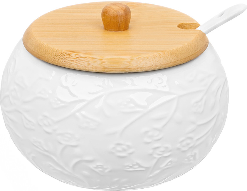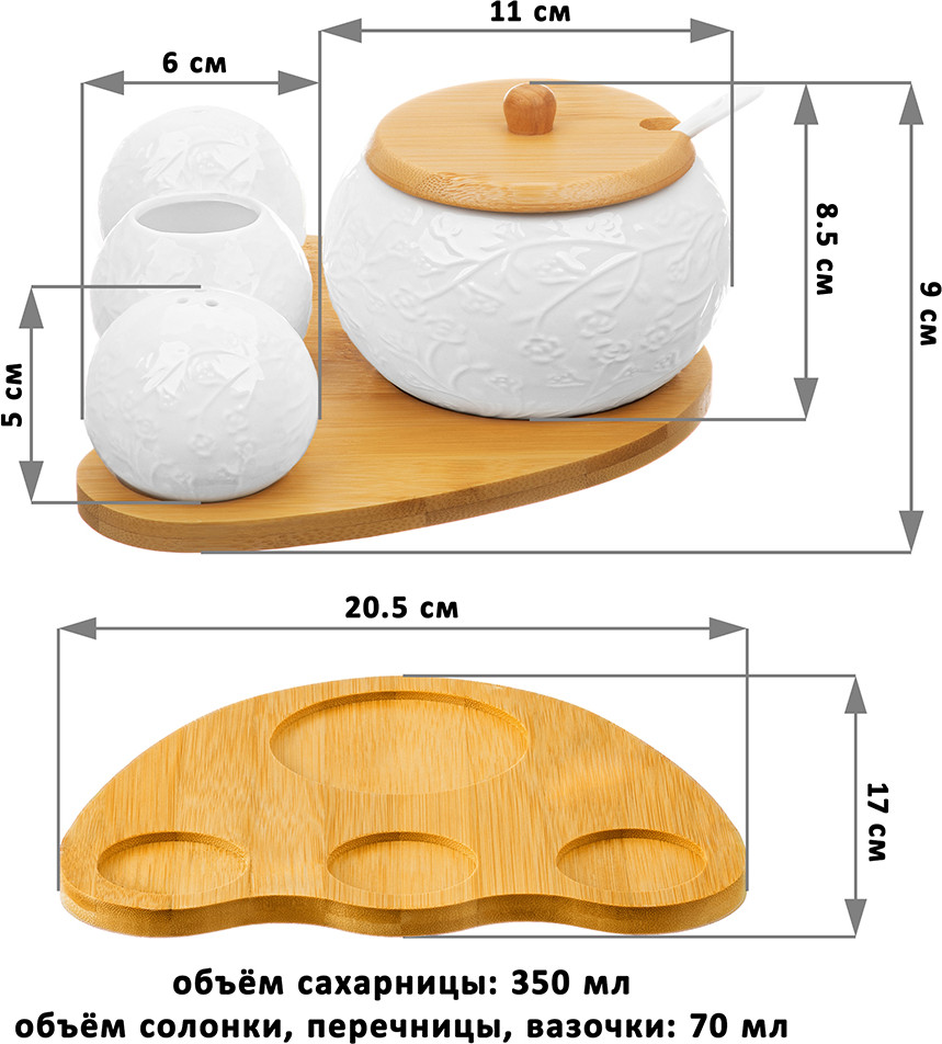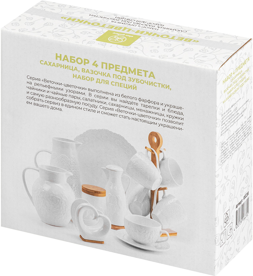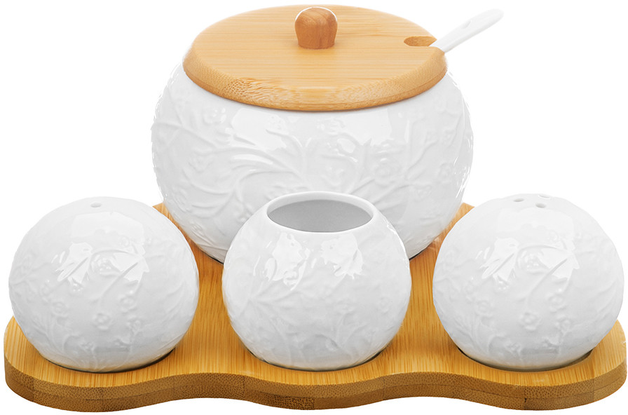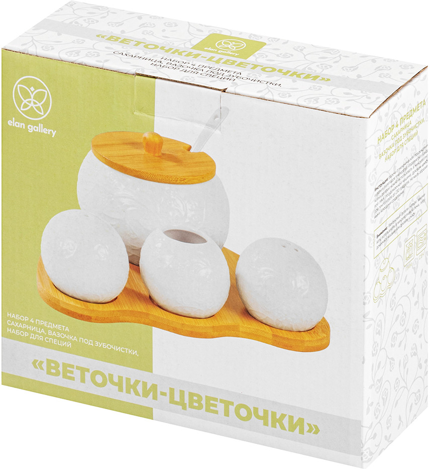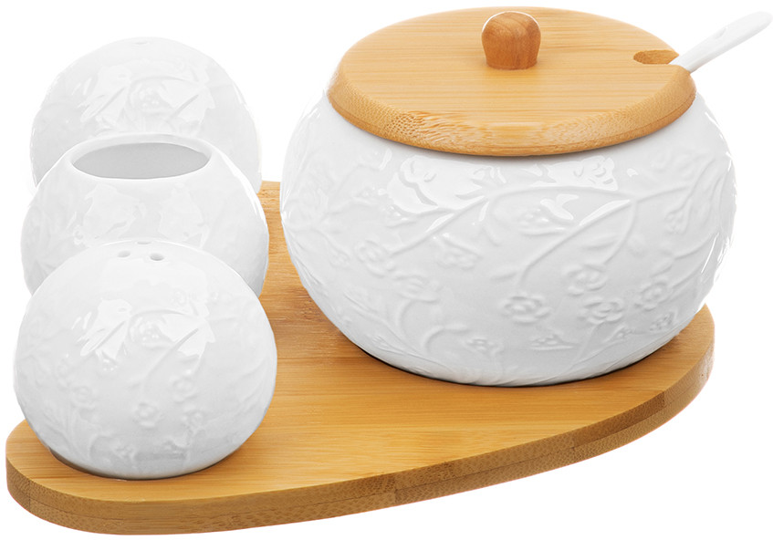 💳 Оплатить за товар можно при получении 🇰🇿 Есть бесплатная доставка по Казахстану от 1 дня 🎁 Копите бонусы с каждой покупки Серия: Веточки-цветочки Набор серии «Веточки-цветочки» на бамбуковой подставке состоит из сахарницы с фарфоровой ложкой, вазочки под зубочистки, солонки и перечницы. Объём сахарницы — 350 мл (размер — 11 × 11 × 8.5 см). Параметры вазочки под зубочистки и баночек для специй: размер — 6 × 6 × 5 см, объём — 70 мл каждая. Размер подставки из бамбука — 20 × 17 × 1 см. Зубочистки входят в комплект. Баночки выполнены из качественного фарфора. Сахарница имеет крышечку из бамбука. Предметы украшены рельефными узорами, что добавит изысканности вашему столу. Емкости для специй снизу имеют отверстия для наполнения, которые закрываются пробками. Набор фарфоровой посуды станет прекрасным дополнением к вашему столу и подойдет к любому интерьеру кухни, столовой или гостиной. Используйте набор для хранения сахара, соли, перца, любых специй и приправ. Каждая баночка будет выполнять свою функцию и сделает прием пищи удобным. Сахарница подойдет не только для хранения сахара, вы можете использовать ее для меда, варенья, орешков или любых сыпучих продуктов. Фарфоровые детали набора можно мыть в посудомоечной машине. Бамбуковые детали нельзя замачивать и использовать в посудомоечной машине! Набор поставляется в стильной картонной упаковке. Баночки станут чудесным подарком для близких и друзей. Подарите посуду маме, бабушке, подруге, сестре, или украсьте свою кухню стильным и функциональным аксессуаром. Набор посуды серии «Веточки-цветочки» станет украшением вашей кухни и поможет создать на ней уют. |