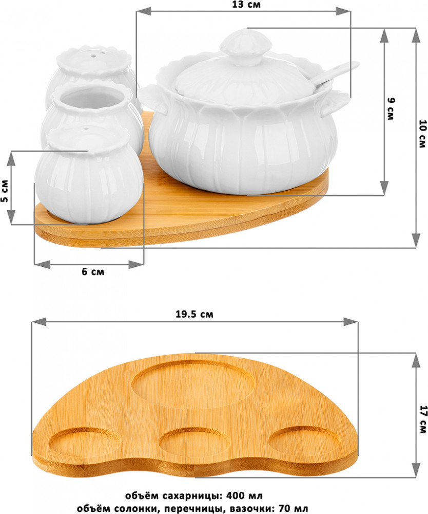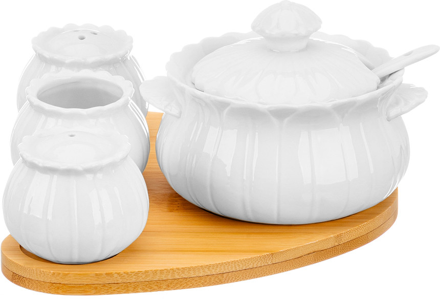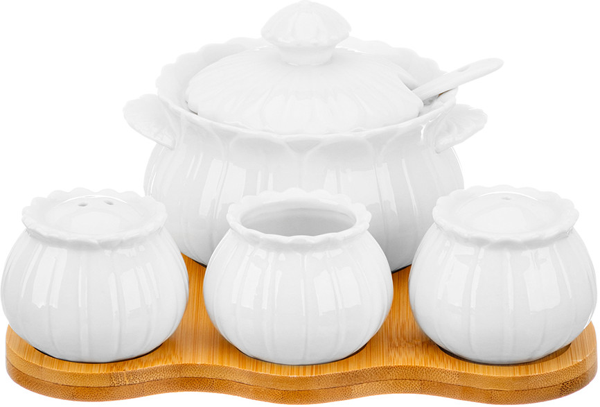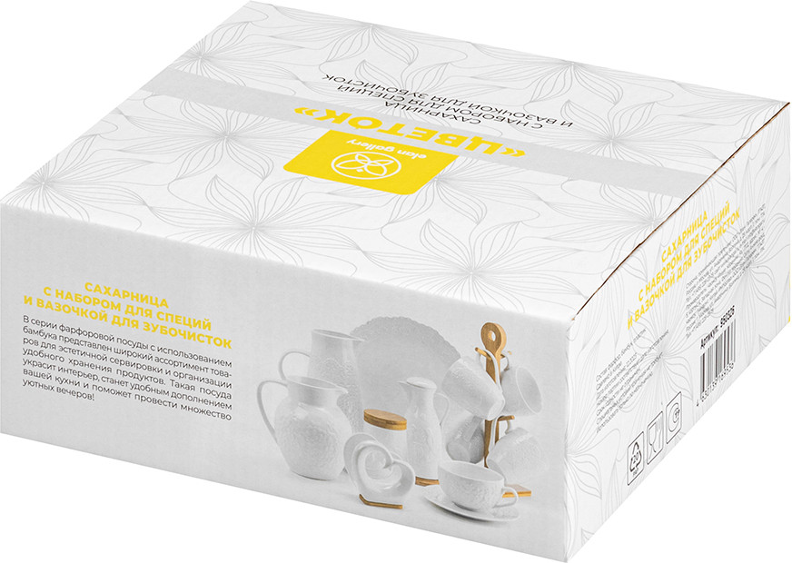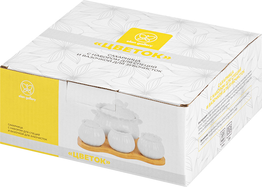 Elan Gallery Набор посуды для сервировки «Цветок»В данный момент этот товар отсутствует в продаже. Возможно, у нас найдется аналогичный или похожий товар здесь. Серия: Цветок Набор из трёх банок для специй Elan Gallery «Тюльпан» 26 × 8.5 × 9.5 см выполнен из белого фарфора и имеет бамбуковую подставку в комплекте. Размер каждой баночки — 8.5 × 8.5 × 8.5 см, объём — 200 мл. Размер подставки из бамбука — 26 × 7.5 × 1 см. У каждой ёмкости в комплекте есть фарфоровая ложечка и крышка из натурального бамбука. Набор подходит для использования под сахар, соль, специи или приправы. Вы можете хранить в нем соусы, орешки или мармелад. Подойдёт для хранения и сервировки мёда, варенья или джема. Без бамбуковых крышечек и подставки фарфоровые детали набора можно использовать в микроволновой печи и посудомоечной машине. Бамбуковые детали нельзя замачивать! Поставляется в стильной картонной упаковке. Набор ёмкостей для хранения с ложкамиНабор «Цветок» на бамбуковой подставке состоит из сахарницы с фарфоровой ложкой, вазочки под зубочистки, солонки и перечницы. Размер комплекта 19.5 × 17 × 10 см. Зубочистки входят в комплект. Баночки выполнены из белого фарфора. Размеры ёмкостей: сахарница на 400 мл 13 × 11 × 9 см, вазочка под зубочистки и баночки для специй — по 70 мл 6 × 6 × 5 см каждая, подставка из бамбука — 19.5 × 17 × 1 см. Ёмкости для специй снизу имеют отверстия для наполнения, которые закрываются пластиковыми пробками. Фарфоровый набор посуды станет прекрасным дополнением к вашему столу и подойдет к любому интерьеру кухни, столовой или гостиной. Используйте набор для хранения сахара, соли, перца, любых специй и приправ. Каждая баночка будет выполнять свою функцию и сделает прием пищи удобным. Сахарница подойдет не только для хранения сахара, вы можете использовать ее для меда, варенья, орешков или любых сыпучих продуктов. Поставляется в картонной упаковке. Баночки станут чудесным подарком для близких и друзей. Подарите посуду маме, бабушке, подруге, сестре, или украсьте свою кухню стильным и функциональным аксессуаром. Набор посуды «Цветок» станет украшением вашей кухни и поможет создать на ней уют. станет украшением вашей кухни или приятным подарком для родных и близких! |