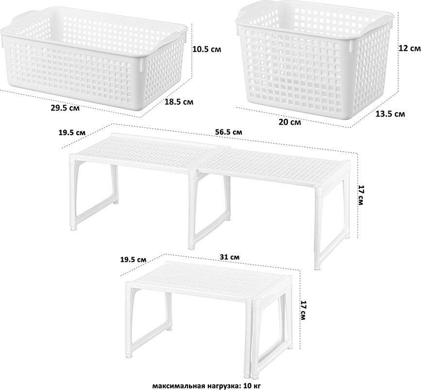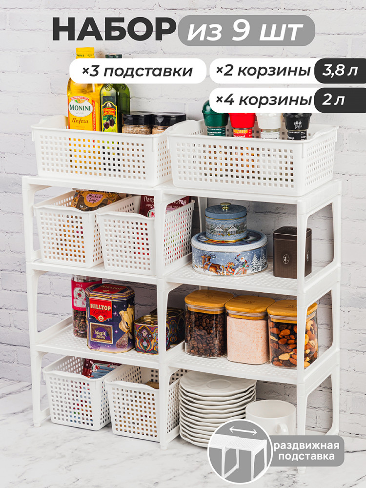 El Casa Набор корзин для хранения с подставками «Лофт»В данный момент этот товар отсутствует в продаже. Возможно, у нас найдется аналогичный или похожий товар здесь. Серия: Лофт В состав набора входят: две корзины объемом 3.8 литров (размер 29.5 × 18.5 × 10.5 см, дно 25 × 16 см), четыре корзины объемом 2 литра (размер 20 × 13.5 × 12 см, дно 15 × 11 см), три подставки раздвижные (размер 31 × 19.5 × 17 см, раздвигается до 56.5 см, максимальная нагрузка 10 кг). Органайзеры выполнены из полипропилена. Преимущество данного материала над обычным пластиком в том, что он легкий по весу и наиболее безопасный для здоровья. В универсальном контейнере белого цвета можно хранить как овощи и фрукты, так и кухонные и хозяйственные принадлежности. Используйте емкость для косметики, бытовой химии, моющих средств. Специальное плетение с дырочками позволяет воздуху проникать внутрь и не дает продуктам испортиться от недостатка кислорода. Корзина может быть использована для белья, полотенец и хранения различных мелочей. Такую подставку можно поставить под раковину в ванной, возле стиральной машины или на полку. Ящички можно хранить компактно — один в другом. Используйте в детской комнате как стеллаж или ящик для игрушек. Товары представлены разных объемов, форм и расцветок, что позволит собрать уникальный набор, подходящий под ваши потребности. |
